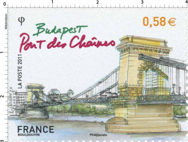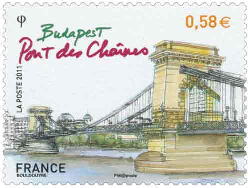 | Commentaire | Capitale européenne classée au Patrimoine Mondial par L'UNESCO, Budapest (formée par La fusion de Buda et de Pest) est illustrée ici par des timbres représentant son Parlement, son Palais Royal, Le Pont des Chaînes et Les bains Széchenyi. Budapest est en effet connue pour Les sources d'eau chaude qui remplissent ses célèbres bains. |