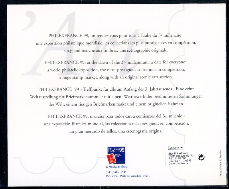 | Description | Philexfrance 99. Exposition philatélique internationale (III). Chefs d'œuvre de l'Art. |