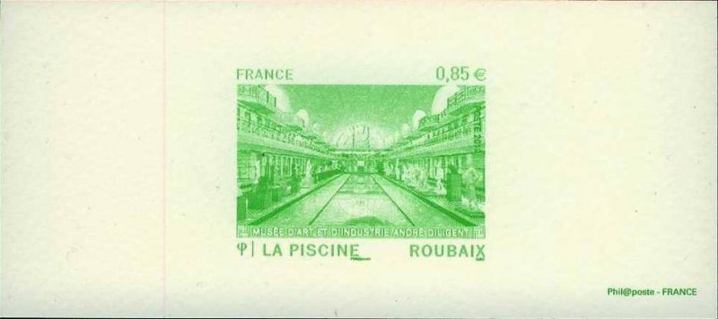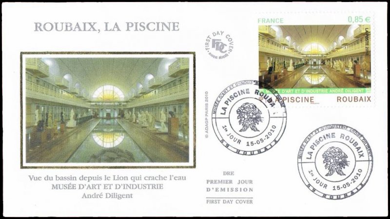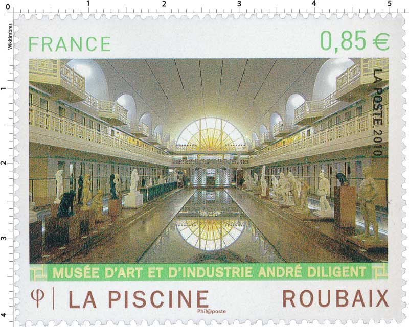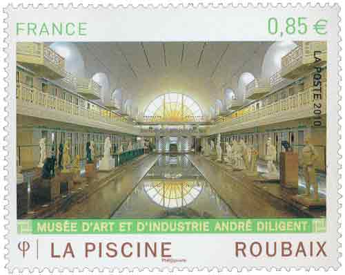 La Piscine abrite une collection exceptionnelle d’arts appliqués à l’industrie, et de collections du XIXe et XXe siècle. Le bassin, représenté sur le timbre, est la pièce maîtresse de la mise en valeur des collections de peintures et de sculptures. L’eau y est déversée par la bouche d’un Neptune, aussi appelé le Lion.