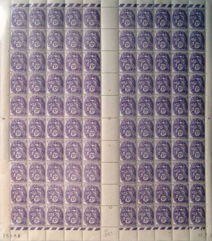 | Commentaire | En savoir plus sur Wikipédia : Type Blanc Émis en juin 1929, le Type Blanc 10 centimes violet marque l’une des dernières apparitions du célèbre type créé par Paul Joseph Blanc, introduit dès 1900. Gravé par Émile Thomas, ce timbre d’usage courant adopte le petit format classique de 20 x 24 mm, imprimé en typographie et dentelé 14 x 13½, fidèle aux caractéristiques de la série. Le visuel, typique du Type Blanc, représente un médaillon orné de deux allégories féminines symbolisant la Liberté et la Paix, encadrant une tablette portant la valeur faciale. Cette composition élégante et très travaillée reflète la recherche esthétique des premières années du XXᵉ siècle, loin des représentations plus modernistes qui apparaîtront quelques décennies plus tard. Bien que le 10 c violet soit mis en vente tardivement dans la vie du type (1929), il reste pleinement intégré à la logique de transition tarifaire de l’époque : la valeur de 10 centimes correspond notamment à des usages complémentaires ou à des affranchissements composés sur courrier intérieur. Sa retraite en décembre 1932 signe quasiment la fin du Type Blanc dans le paysage postal français, progressivement remplacé par des types plus récents comme le Pasteur ou le Semeuse fond plein. Présenté en feuilles de 150 timbres, ce 10 c se distingue par une production moins documentée : aucune quantité d’émission fiable n’a été conservée, ce qui nourrit l’intérêt des spécialistes. Peu coûteux à l’achat, il demeure un incontournable pour les collections thématiques dédiées aux timbres courants, à l’histoire postale de l’entre-deux-guerres, ou encore à l’évolution des tarifs. |