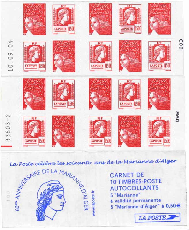 | Commentaire | Carnet à plat de guichet. 5 TP Marianne d'Alger + 5 TP Marianne du 14 juillet Premier jour le 10/11/2004 |