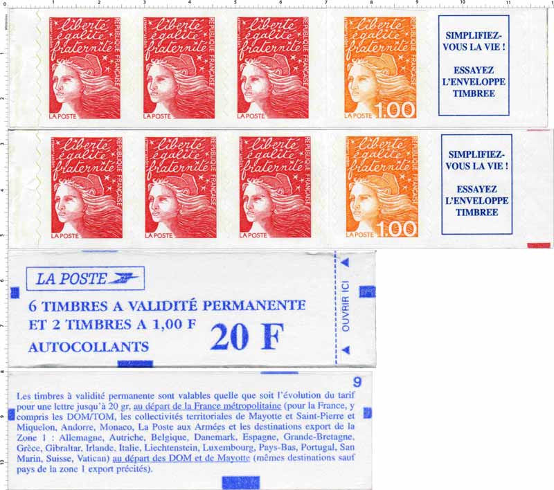| Commentaire | Carnet composé de deux bandes comprenant chacune 3TVP, 1 timbre à 1,00fr et 1 vignette simplifiez-vous la vie - Essayez l'enveloppe timbrée. Carnet pour distributeur. Emis 15/09/1997 et retiré 31/12/2001 |