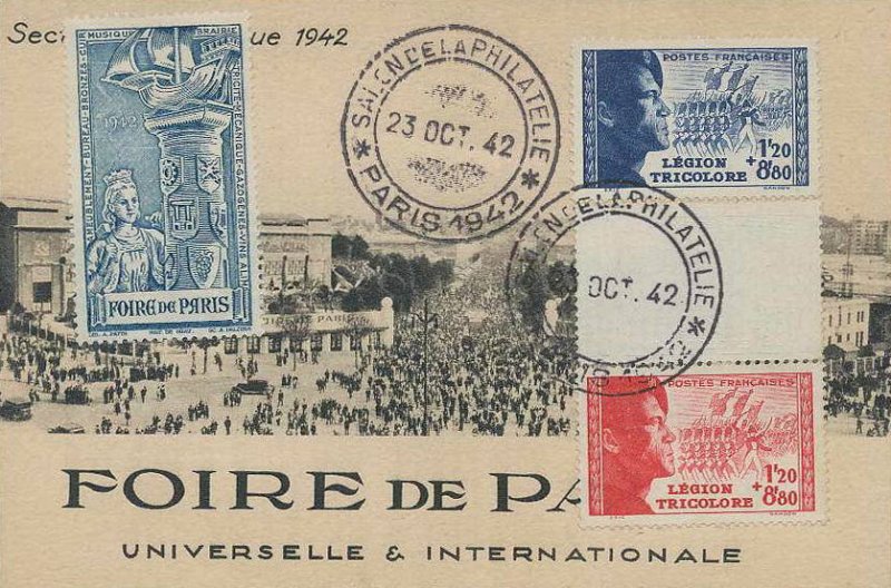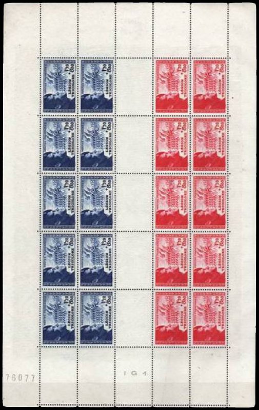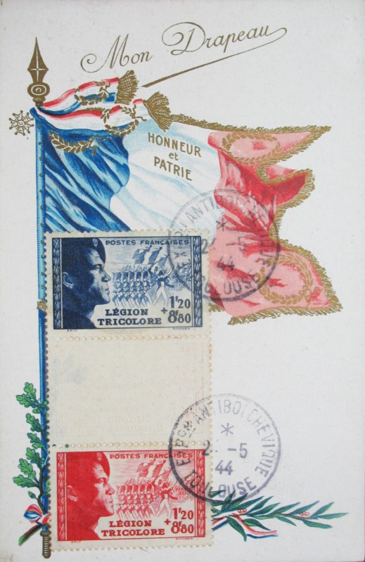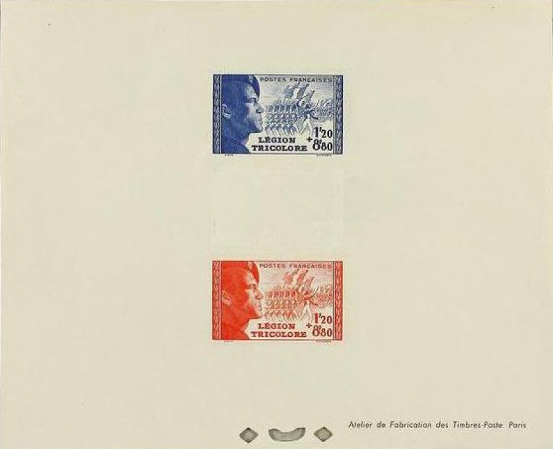 | Commentaire | Légion tricolore. Démonétisé le :01/11/1944. Les feuilles de 20 TP sont composées sur la partie haute de la feuille de deux rangées de 5 TP de couleur bleue, la partie médiane d'une rangée de 5 vignettes blanches reprenant le visuel du timbre et la partie basse de la feuille de deux rangées de 5TP de couleur rouge. Ces timbres se collectionnent en triptyque avec la vignette centrale blanche séparant les deux timbres, ou en bande de 5 verticale. |