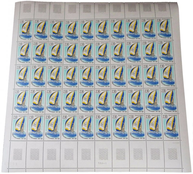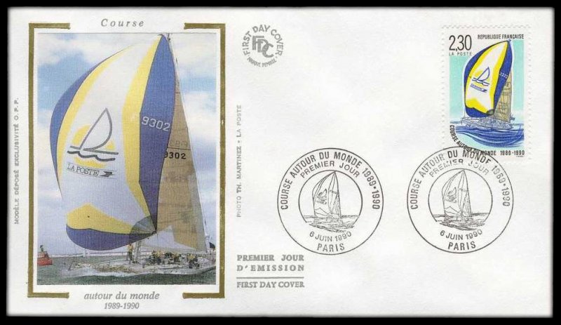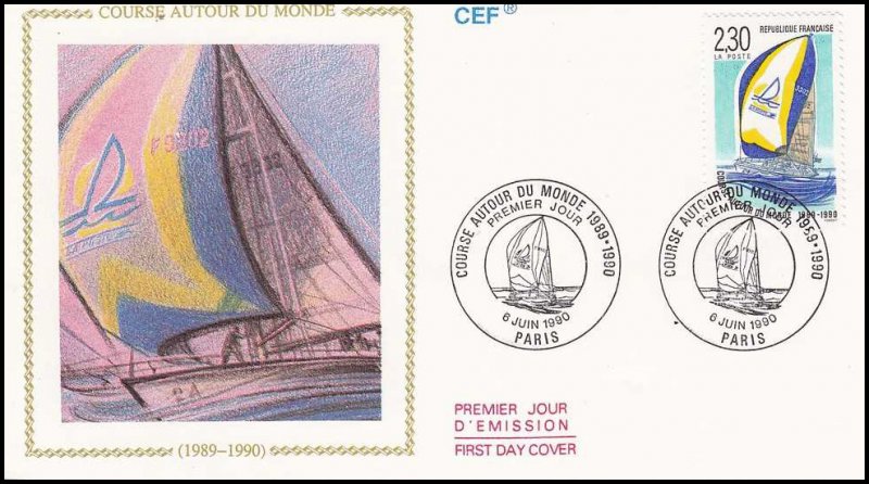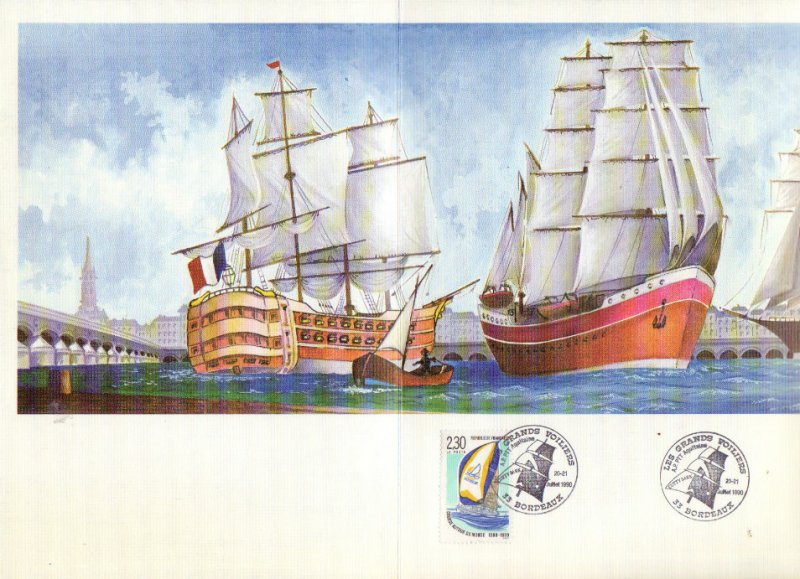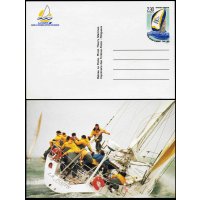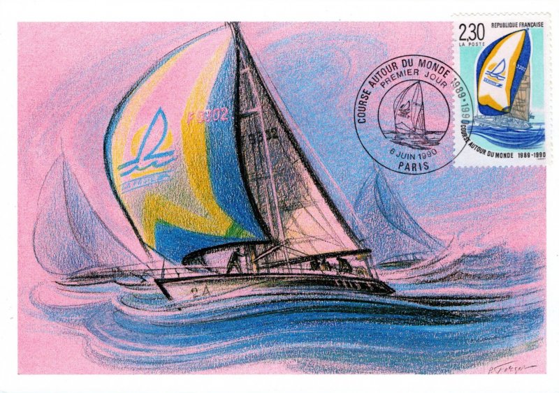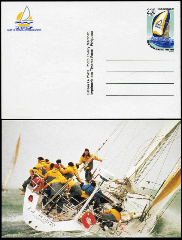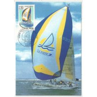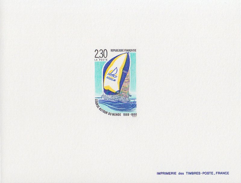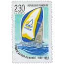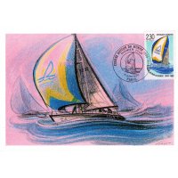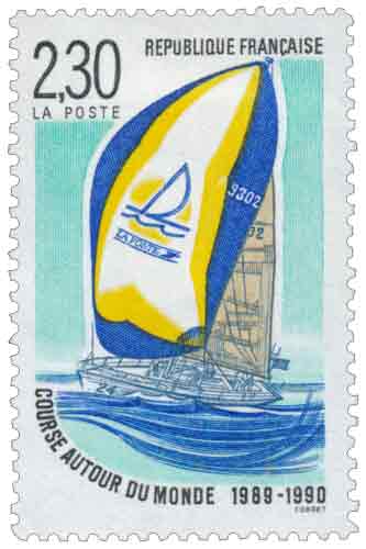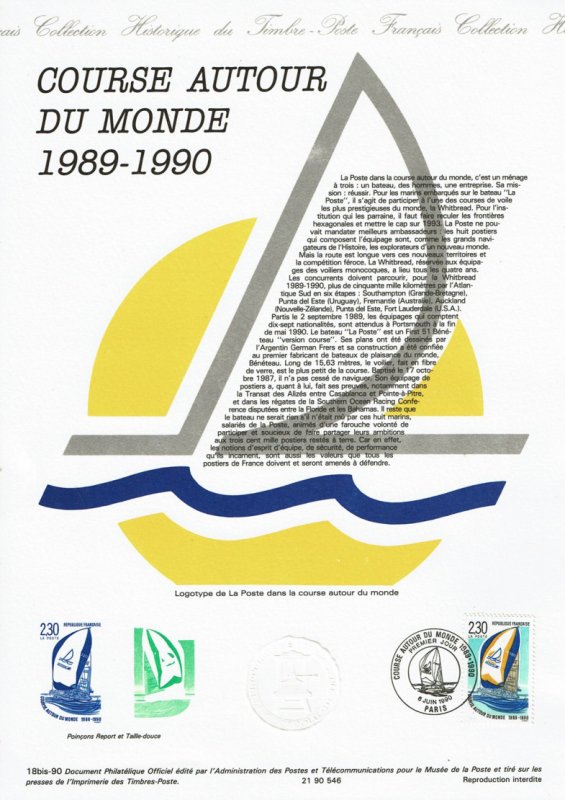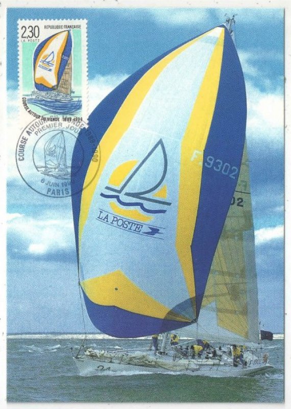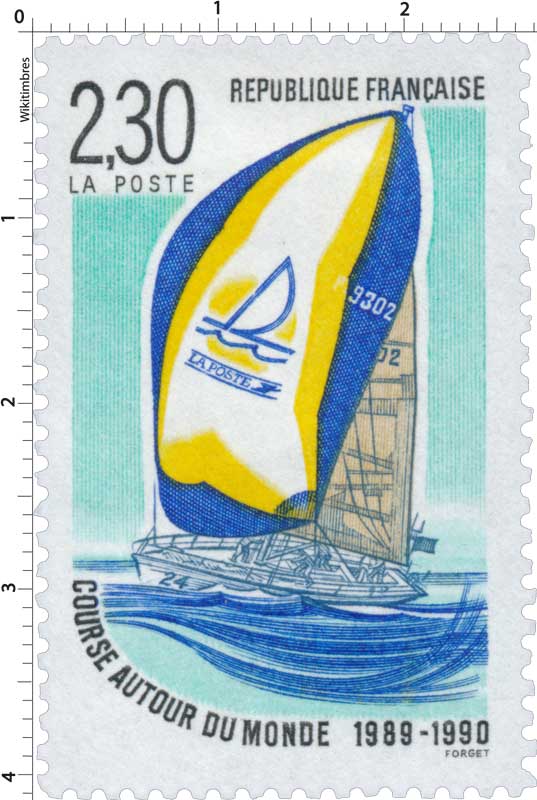 | Commentaire | Visuel : le voilier monocoque de la série First 51 Bénéteau "version course" au nom de La Poste, ayant participé à la Whitbread 1989-1990, par l'Atlantique Sud en six étapes : Southampton (Grande-Bretagne), Punta del Este (Uruguay), Fremantle (Australie), Auckland (Nouvelle-Zélande), Punta del Este et Fort Lauderdafe (U.S.A.). Partis le 2 sept.1989, avec un équipage de huit marins, salariés de La Poste, ils sont arrivés fin mai 1990. |