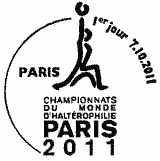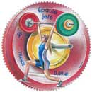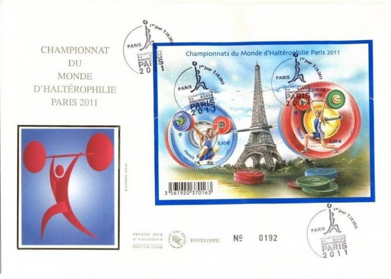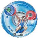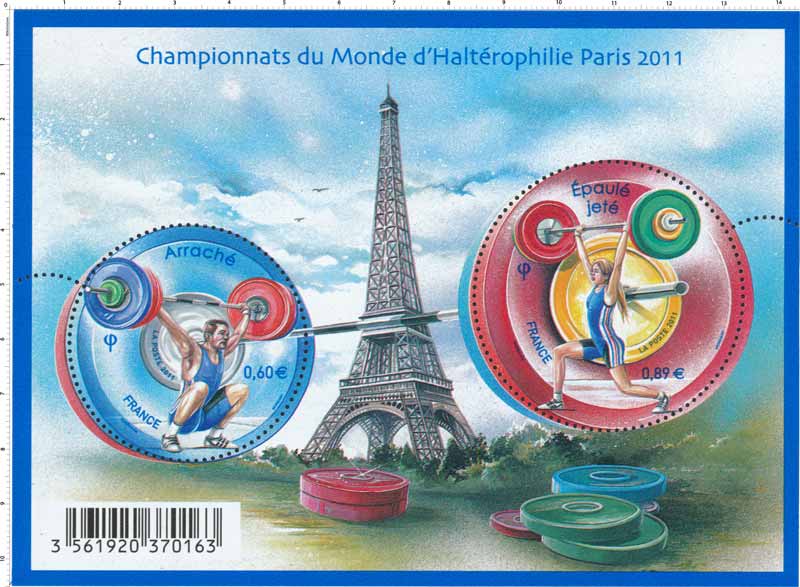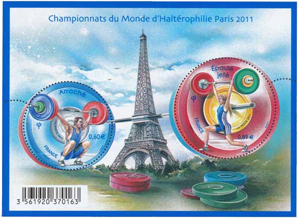 | Commentaire | Du 1er au 14 novembre 2011 se tiendront à Disneyland-Paris Les Championnats du Monde d'Haltérophilie organisés par La Fédération Internationale d'Haltérophilie (lWF) qui réunit 167 pays. Les deux timbres du bloc représentent deux athlètes de L'équipe de France en mouvement : La réception d'un arraché pour L'haltérophile masculin et Le passage en fente d'un épaulé jeté pour L'athlète féminine |