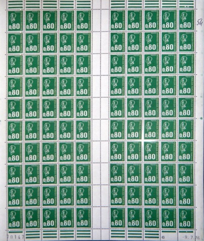 | Commentaire | Le Béquet 0,80 vert est normalement surchargé d'une bande phosphorescente à droite. Au cours de la fabrication, sans doute à la suite d'un encrier vide de l'encre phosphorescente, des timbres n'ont pas été surchargés de bande phosphorescentes. La poste afin d'éviter la spéculation sur ce timbre non surchargé a décidé d'imprimer des timbres non surchargés de bandes phosphorescentes. Un tirage spécial a été effectué les 13 et 14 novembre 1977 (coins datés connus). Le timbre a été mis en vente début décembre 1977. Ce qui permet de reconnaître le tirage du 0,80fr vert typographié anti spéculation est que le papier qui a servi à l'impression est avec azurants optiques sous UV, alors que le timbre vert 0,80fr sans bandes phosphorescentes accidentelles est imprimé sur du papier neutre sous UV. La gomme est brillante pour l'un et l'autre timbre |