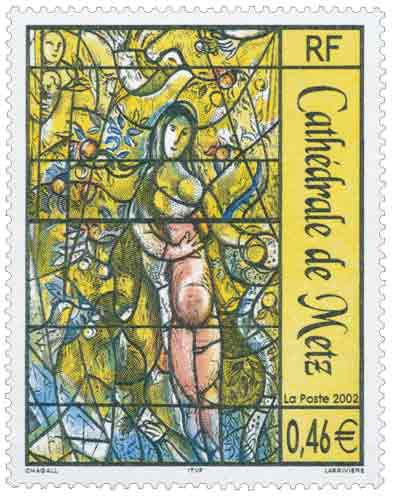 | Commentaire | Description synthétique du visuel du timbre : La cathédrale de Metz est le plus majestueux édifice que le Moyen Age ait laissé en Lorraine. Construite sur une période de trois siècles, elle reflète les différentes étapes de l’évolution du style gothique. Son architecture qui laisse une grande place aux ouvertures a permis la réalisation de nombreux grands vitraux par les peintres verriers les plus célèbres de leur temps : Hermann de Munster ou Valentin Bousch, entre autres. A l’époque contemporaine, la conception de nouveaux vitraux fut confiée à Jacques Villon, Gaudin, Roger Bissière et Marc Chagall. Un détail du panneau Ève et le serpent d’un vitrail que Chagall a créé en 1963-1964, et qui se situe face à l’autel, illustre le timbre. |