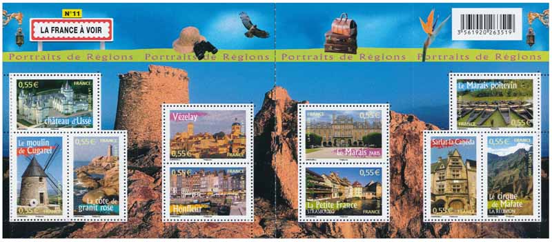 | Commentaire | La série philatélique Portraits de régions a été inaugurée en 2003. L’objectif de cette série est de répondre aux attentes du grand public et d’être diffusée le plus largement possible sur le plan national. Elle célèbre la France, ses coutumes locales, ses traditions populaires, sa gastronomie, son architecture... Le 11e bloc rend hommage aux diverses régions de France à travers leurs monuments, l’architecture et les sites naturels : le Marais (Paris), Vézelay, la Petite France (Strasbourg), Sarlat-la-Canéda, le moulin de Cugarel, Honfleur, la côte de granit rose, le Marais poitevin, le cirque de Mafate (Ile de la Réunion) et le château d’Ussé |