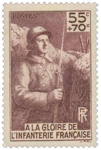 | Commentaire | A la gloire de l'infanterie française. Ce timbre vertical de couleur brun-violet est une émission à surtaxe de 1938, dédié à la gloire de l'Infanterie Française, et probablement lié à la commémoration des soldats de la Première Guerre mondiale. Contexte de l'Émission et Surtaxe Le timbre a été mis en vente le 16 mai 1938. Il se distingue par une surtaxe particulièrement élevée par rapport à sa valeur faciale.
