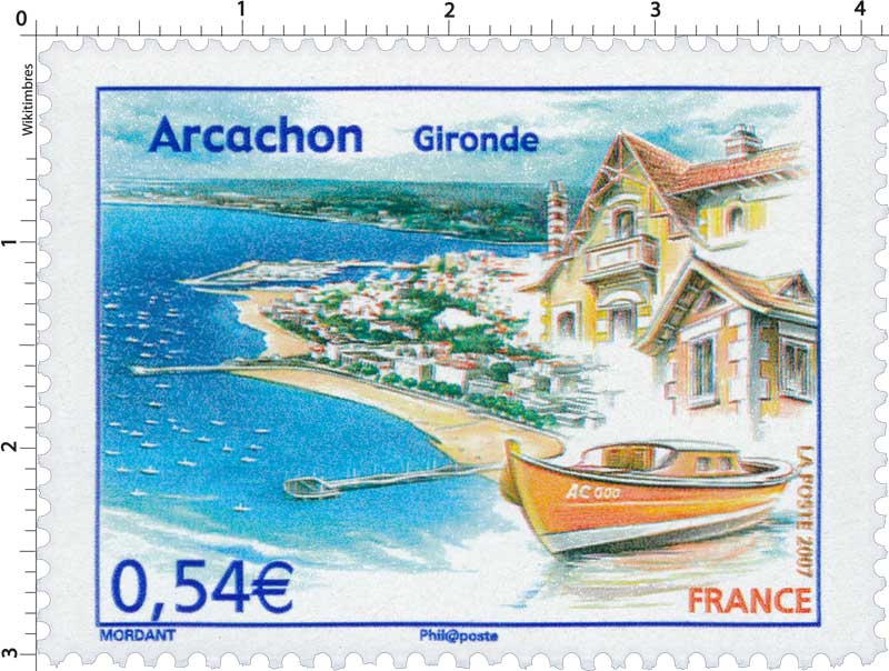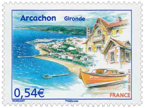 | Description | Arcachon (Gironde), timbre émis à l'occasion du 150e anniversaire de son accession au statut de commune, par décret impérial (Napoléon III), le 2 mai 1857 |