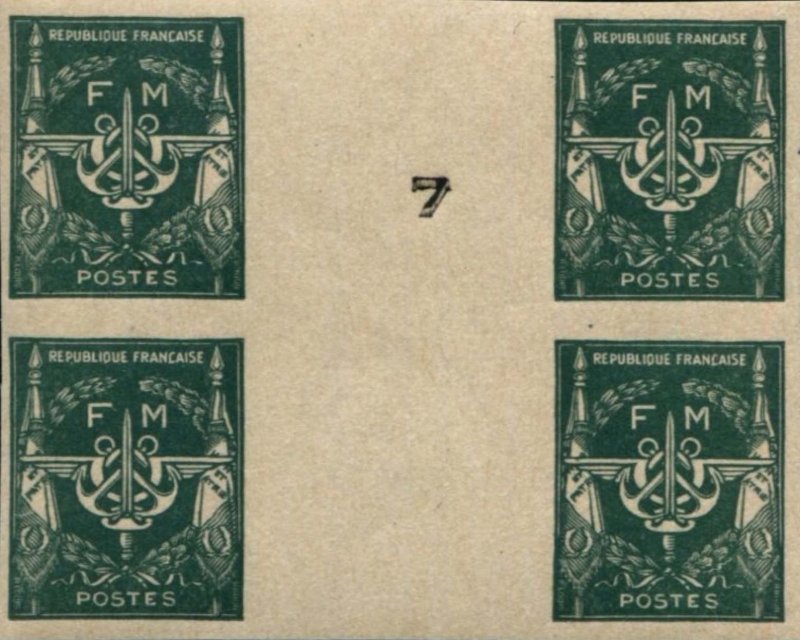 | Commentaire | Ce timbre poste représente l'insigne interarmes. Le glaive, pointe en haut, symbolise l'Armée de terre, les ancres entrecroisées symbolisent la Marine et les ailes déployées symbolisent l'armée de l'air. De part et d'autre de la pointe du glaive, les deux lettres F et M . L'ensemble est entouré d'une couronne composée à droite de feuilles de chêne et à gauche de feuilles de laurier. L'ensemble est flanqué de deux drapeaux. Le timbre ne porte pas de valeur faciale, c'est également une nouveauté! La poste vient d'inventer, quarante six ans avant de mettre en service définitivement le No Value Indicator ou N. V. I. , c'est-à-dire le Timbre à Validité Permanente ou T. V. P. . |