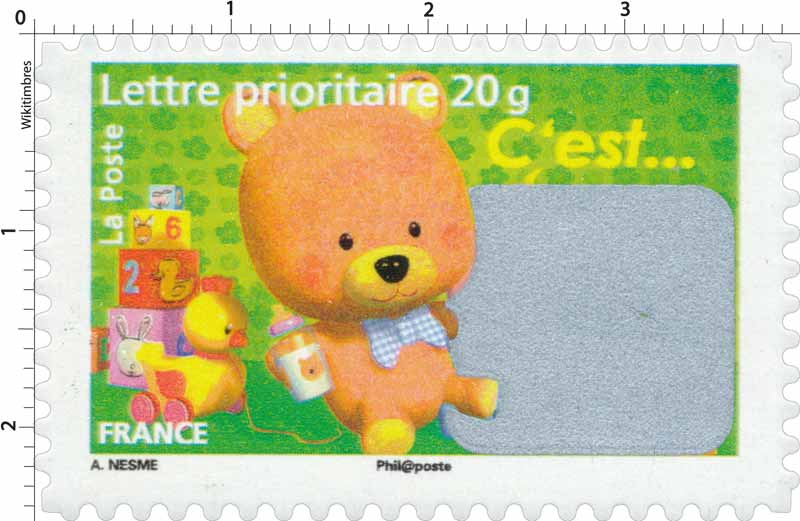 | Commentaire | La mise en vente premier jour a lieu le 28 mai au Jardin d'acclimatation, à Paris. Le bébé garçon d'Alexis Nesme est repris sur le cachet premier jour. Un nouveau concept de timbre est proposé cette année pour les carnets Naissance : le timbre à gratter. |