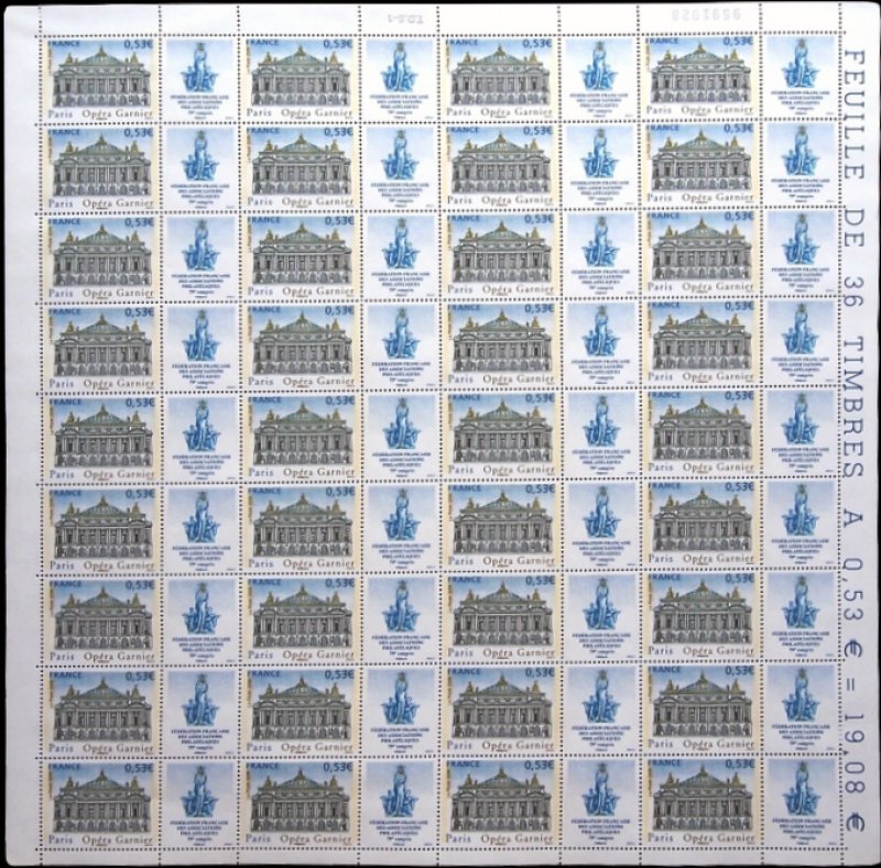 | Commentaire | Visuel : la façade de l’Opéra Garnier et le triptyque sculpté ornant la coupole du monument, Apollon, dieu des arts, de la lumière et de la divination, brandissant une lyre, et ses deux muses, représentant la Poésie et la Musique Timbre imprimé attenant à une vignette sans valeur. La fédération française des associations philatéliques organise son 79e congrès à Paris. Une vue de la façade de l’Opéra Garnier, un des monuments emblématiques de la Capitale, illustrera le timbre. La vignette sera agrémentée de la représentation du triptyque qui orne le dôme central du monument , les 3 sculptures Apollon, la Poésie et la Musique |