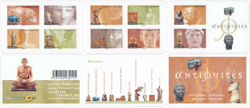 | Commentaire | ANTIQUITÉS ÉGYPTIENNES - ÉTRUSQUES - GRECQUES - ROMAINES Pour 2007, La Poste a choisi d’illustrer les 10 timbres-poste de son carnet consacré à l’art par des antiquités : égyptiennes - le scribe, l’hippopotame, Amenemhat III & la stèle du harpiste. |