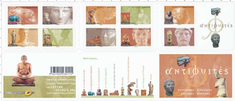 | Commentaire | ANTIQUITÉS ÉGYPTIENNES - ÉTRUSQUES - GRECQUES - ROMAINES Pour 2007, La Poste a choisi d’illustrer les 10 timbres-poste de son carnet consacré à l’art par des antiquités : égyptiennes - le scribe, l’hippopotame, Amenemhat III & la stèle du harpiste. |