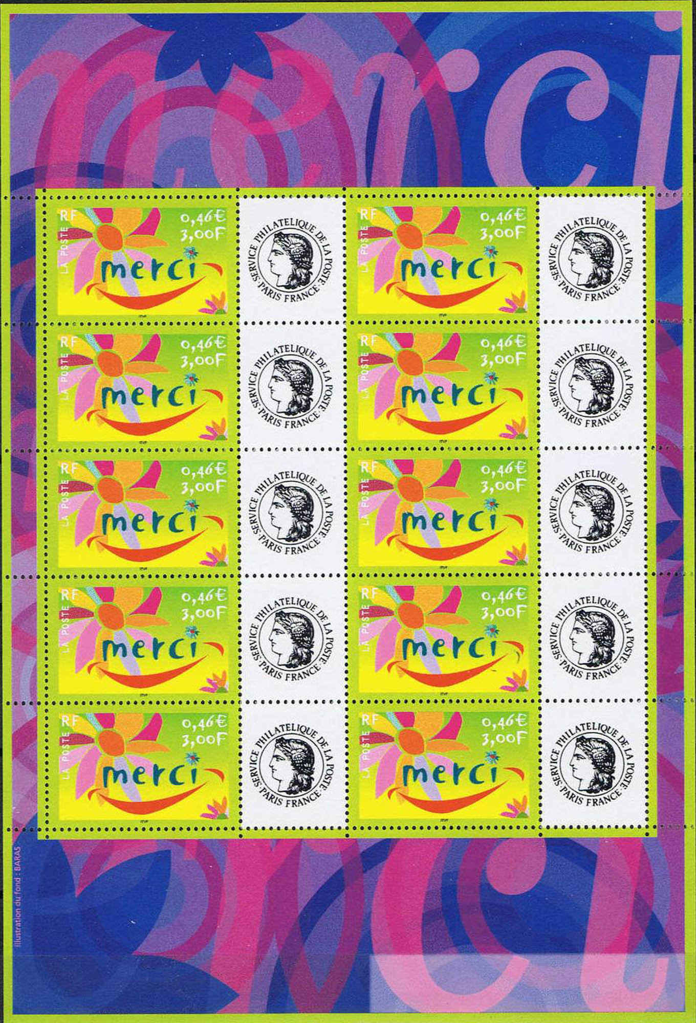 | Commentaire | Description synthétique du visuel du timbre : Une fleur, symbole du remerciement, illustre le timbre dans un style moderne aux couleurs très fraîches. La feuille a été interprétée pour évoquer un sourire, ce qui confère à ce visuel un caractère susceptible de séduire les entreprises. Timbre sans millésime |