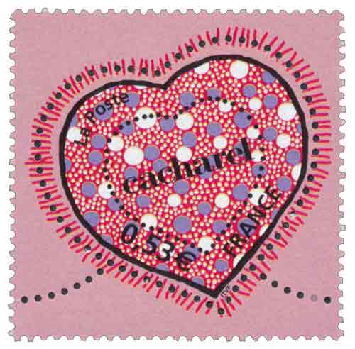 | Commentaire | La collection des « cœurs griffés » s’agrandit : après Yves Saint-Laurent, Christian Lacroix, Torrente et Chanel, Cacharel rejoint le cercle des couturiers « timbrifiés ». Dessinés par le duo de stylistes « Cléments Ribeiro » (Suzanne Cléments et Inacio Ribeiro), le timbre à 0,53 € n’est pas sans évoquer le Liberty, emblématique de la marque. Timbre sans millésime |