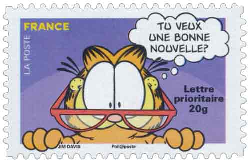 | Commentaire | La mise en vente anticipée a lieu le 18 septembre à Saint-Brice-Courcelles avec un cachet illustré du chat Garfield de face et souriant, sans mention « premier jour ». Timbre sans millésime |