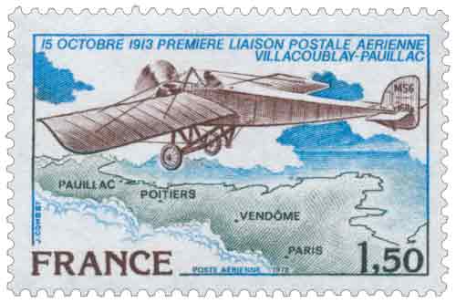 | Description | 65e anniversaire de la première liaison postale aérienne officielle entre Villacoublay et Pauillac par le lieutenant Ronin (1886-1953) à bord d'un monoplan Morane Saulnier, il fit escale à Poitiers |