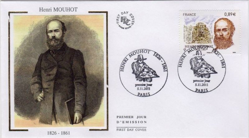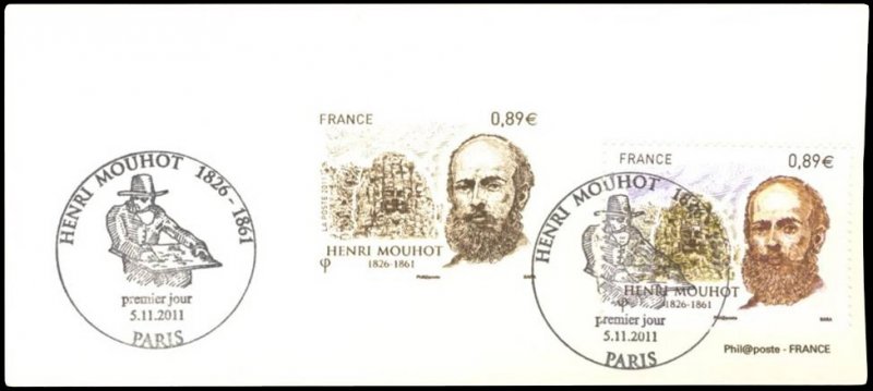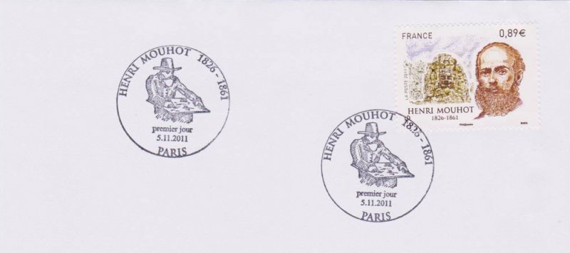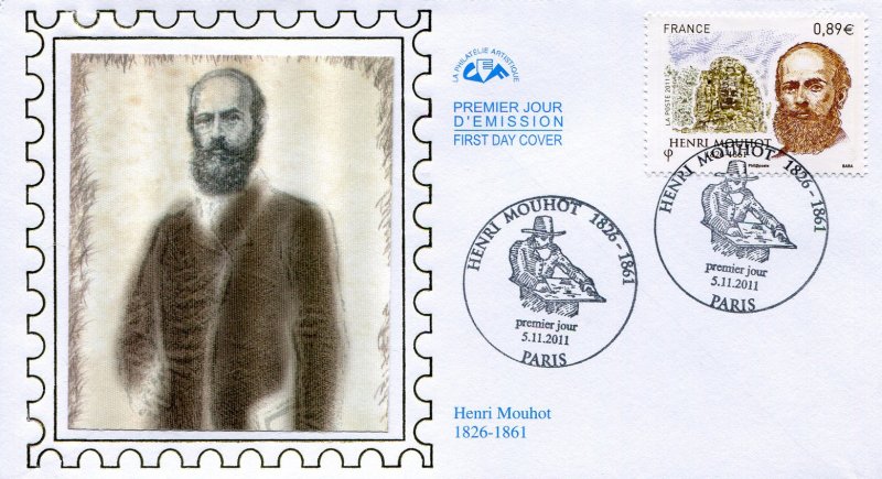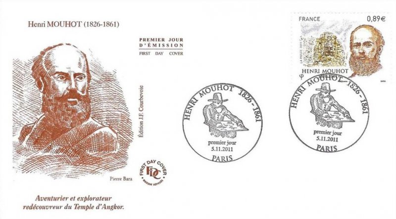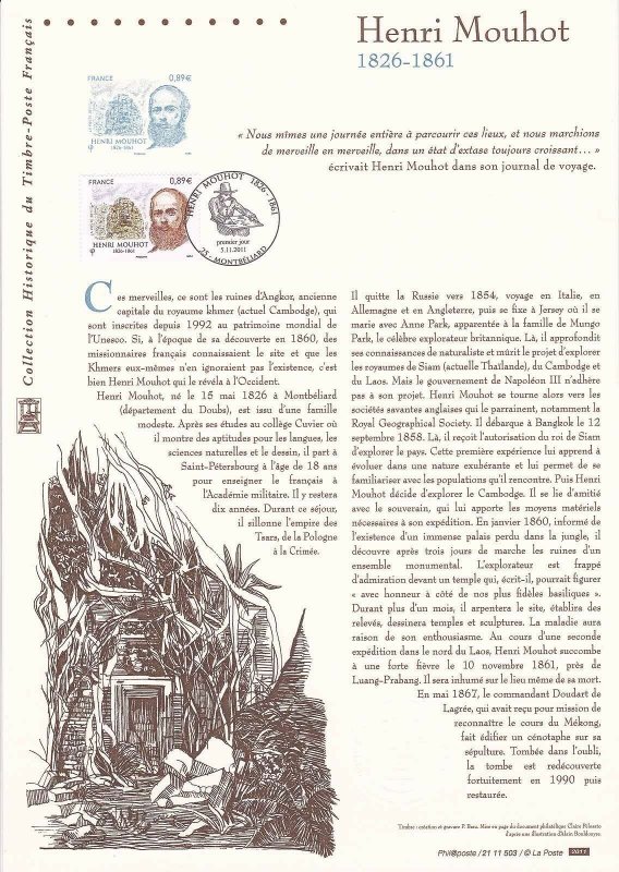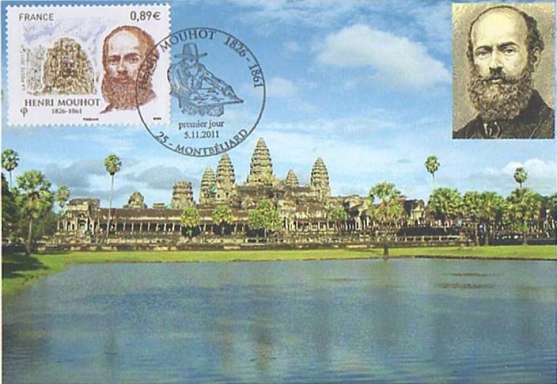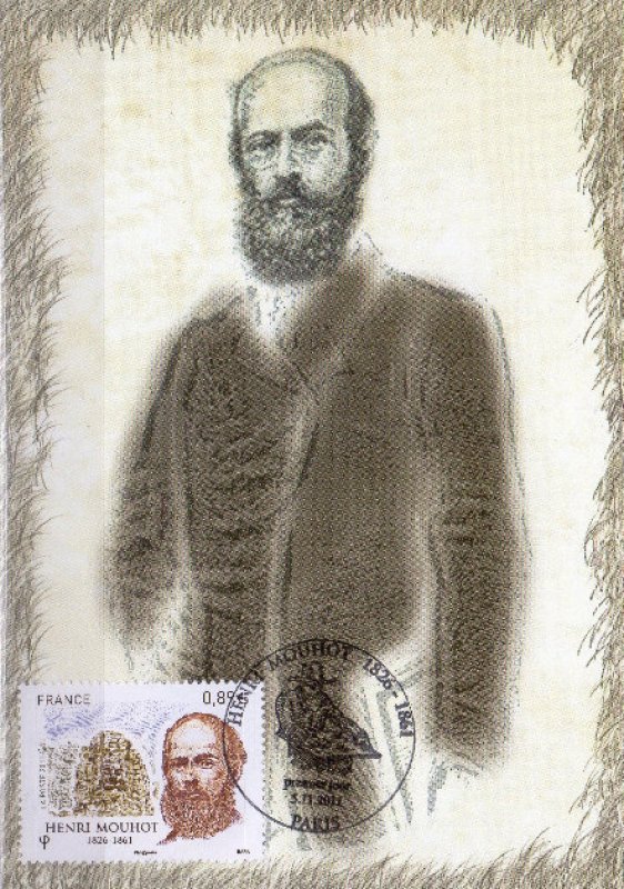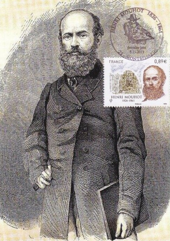 | Commentaire | Alexandre Henri Mouhot est né à Montbéliard en 1826. Très jeune, passionné d’explorations et poussé par l’apport du daguerréotype, il sillonne de nombreux pays : Russie, Angleterre, où il épouse une descendante d’un autre grand explorateur, Mungo Park, Allemagne, Italie, Pays-Bas… Voyageur infatigable mais aussi naturaliste, il effectue plusieurs expéditions à partir de 1858, au Siam, au Laos et au Cambodge, et fait redécouvrir aux occidentaux le site d’Angkor, l’ancienne capitale du royaume Khmer, qu’il étudie et photographie en 1859. Il est également le premier français à visiter Luang Prabang au Laos, où la fièvre jaune l’emporte en novembre 1861. Il est inhumé au bord du Mékong.