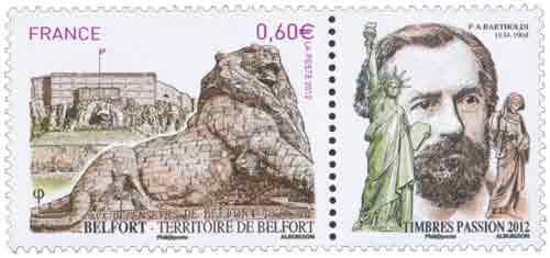 | Commentaire | Le Lion représenté sur le timbre est bien sûr le monument le plus célèbre de Belfort, préfecture du Territoire de Belfort, traversée par la rivière la Savoureuse. OEuvre du sculpteur Frédéric-Auguste Bartholdi, ce lion a été érigé en hommage à la résistance héroïque des belfortains, pendant la guerre de 1870, contre les Prussiens. (Une célèbre réplique est installée place Denfert-Rochereau, dans le 14e arrondissement de Paris, en hommage au colonel Denfert-Rochereau, grand défenseur de Belfort). Mais Belfort, c’est aussi une citadelle et des fortifications dressées par Vauban avec notamment sa porte de Brisach, classée aux monuments historiques en 1913. Une vignette représentant le portrait ainsi que quelques unes des oeuvres de Bartholdi (dont la célèbre statue de la Liberté, ainsi que la statue en hommage à Martin Schongauer) est accolée au timbre. Du 2 au 4 novembre 2012, la ville de Belfort accueille le congrès Timbres Passion. Timbre à date “Premier Jour” conçu par Claude Perchat