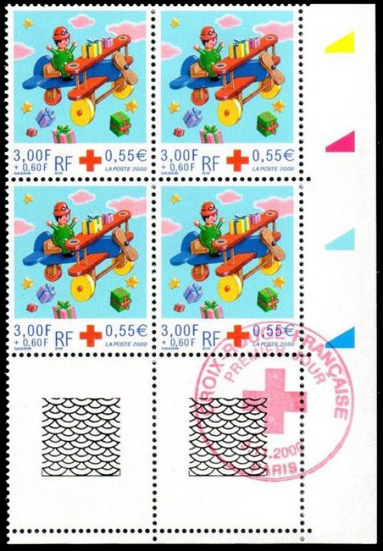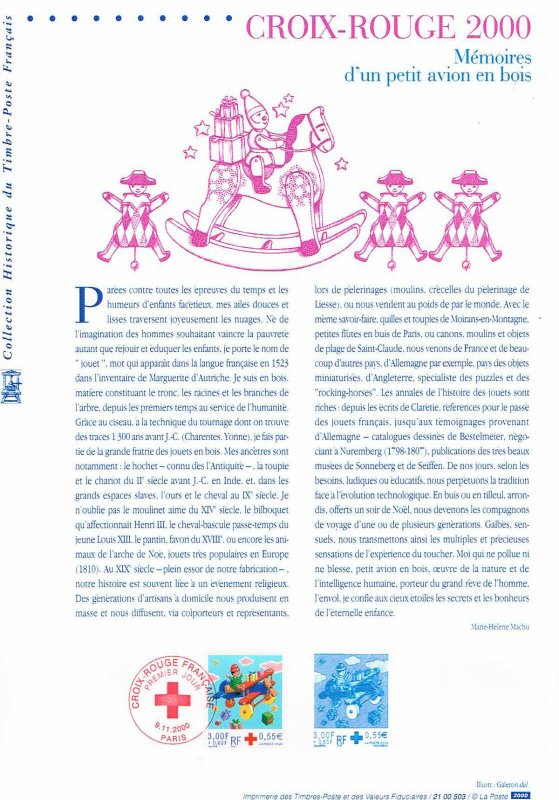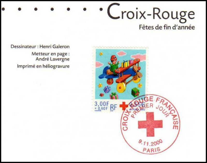 | Commentaire | Description synthétique du visuel du timbre : Un jouet ancien, fait de bois, anime le visuel de ce timbre de fin d’année. Un petit aviateur à bord de son avion, traités dans un style réaliste et mis en scène sur un fond imaginaire, parsème une pluie d’étoiles et de cadeaux multicolores. Ce timbre est grevé d'une surtaxe au profit de la Croix Rouge française. Le même timbre émis en carnet est dentelé 13demi x 13. Le timbre de feuille comme le timbre de carnet sont imprimés sur papier avec azurants optiques visibles sous UV. |