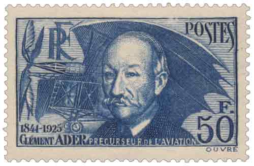 | Commentaire | Clément Ader (1841-1925). Retiré le: 05/10/1934 et retrait définitif le 25 novembre 1940 Voir la vidéo "Histoires de timbres" Émis le 16 juin 1938 comme valeur haute de la poste ordinaire, ce timbre de 50 francs outremer honore Clément Ader, ingénieur toulousain pionnier de l'aviation né en 1841 à Muret et mort en 1925. Dessiné et gravé en taille-douce par Achille Ouvré, il est imprimé en rotatif à feuilles de 25 exemplaires. Tiré à 570 000 exemplaires dont 430 000 surchargés, il servait aux affranchissements élevés comme les recommandés lourds ou les colis postaux intérieurs. L'appareil représenté est l'Éole, machine à vapeur ailée avec laquelle Ader revendiqua le 9 octobre 1890 un bref décollage de quelques dizaines de mètres à Armainvilliers, exploit officiellement reconnu en France comme le premier envol motorisé d'un engin plus lourd que l'air, bien que son absence de contrôle effectif en fasse un jalon controversé dans l'histoire de l'aviation moderne. |