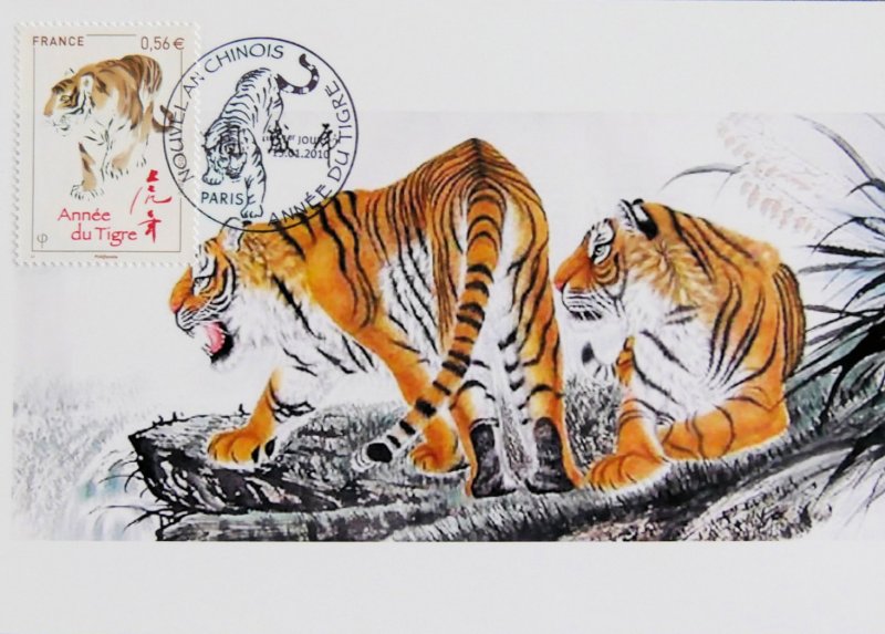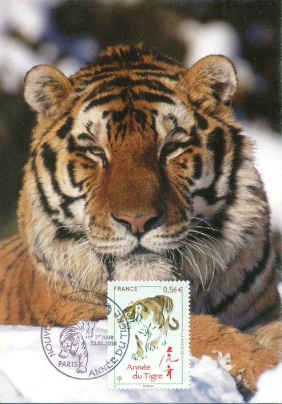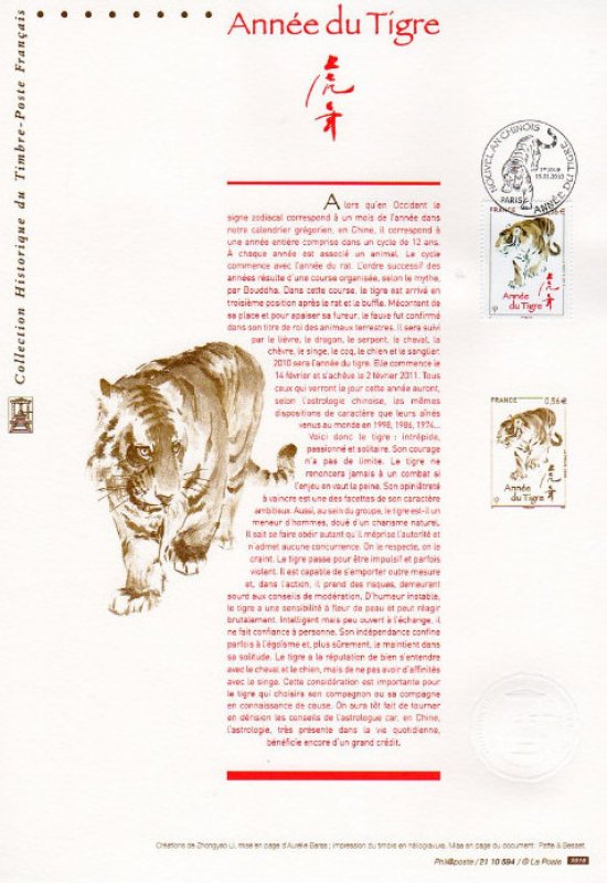 | Commentaire | Le premier calendrier astrologique est apparu sous le règne de l'empereur Huang au 3e millénaire avant Jésus-Christ. Inscrite dans un cycle de 12 ans, chaque année du calendrier chinois est placée sous le signe d’un animal et est réputée en posséder ses caractéristiques. Cette année, le 14 février 2010, nous entrerons dans l'Année du Tigre. Issu du folklore local, le Tigre n'est pas considéré comme un animal cruel et agressif, mais comme le défenseur du pauvre et de l'orphelin. En Chine il est aussi un animal magique qui fait fuir les mauvais esprits et représente la force et la prouesse militaire. |