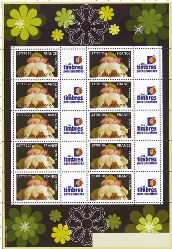 | Description | Timbre pour naissances. C'est un garçon. Type du T.-P. de même date. Avec vignette Les timbres personnalisés ou personnalisable |