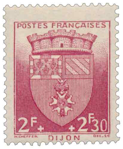 | Commentaire | Ce timbre gommé émis en 1942 appartient à la deuxième série des Armoiries des villes de France, ensemble semi-postal conçu pour associer la valorisation de l’héraldique municipale à une contribution financière obligatoire au Secours National. Il représente le blason de Dijon, composition héraldique complexe rappelant le statut historique de la ville comme capitale du duché de Bourgogne. Dessiné et gravé par Henry Cheffer, le timbre est imprimé en taille-douce rotative, procédé particulièrement adapté à la restitution précise des partitions et bordures héraldiques dans un format réduit. La valeur faciale de 2 francs, assortie d’une surtaxe de 2,30 francs, correspond à des usages postaux étendus — lettres de poids intermédiaire, imprimés lourds, suppléments de recommandation et envois à destination des militaires — illustrant la complexité tarifaire de la période et la fonction semi-courante de cette émission d’octobre 1942. |