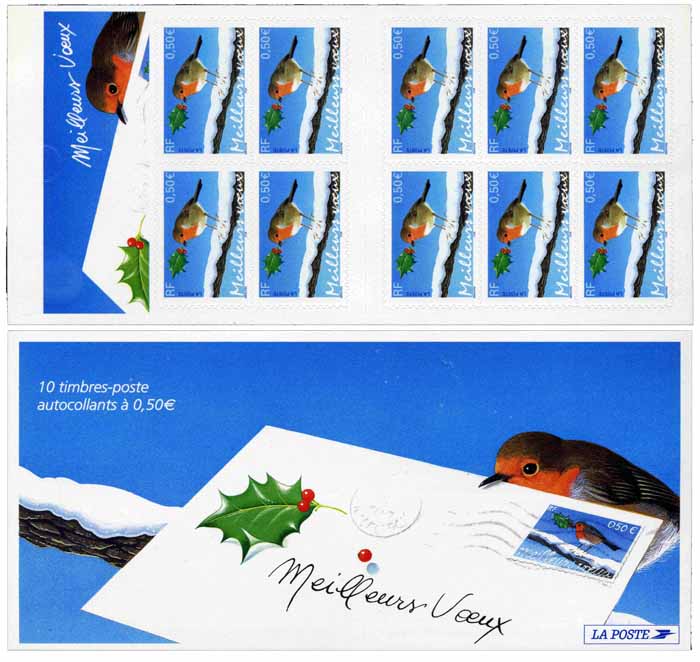 | Commentaire | Existe non surchargé accidentellement de bandes phosphorescentes. Meilleurs vœux Timbre auto-adhésif émis en carnet (N° BC3622). Description synthétique du visuel : Le visuel de la couverture présente une illustration réalisée dans le même esprit que le visuel du timbre Meilleurs Vœux : on y retrouve un rouge-gorge « messager ». Vendu à plat, le carnet peut néanmoins être plié et présente une encoche permettant de maintenir le rabat. Timbre sans millésime |