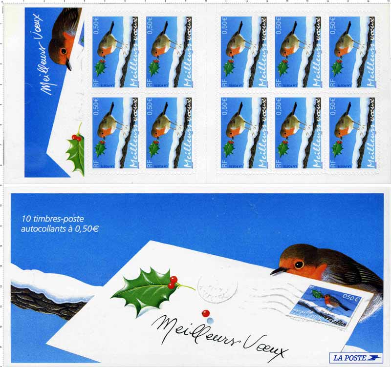| Commentaire | Existe non surchargé accidentellement de bandes phosphorescentes. Meilleurs vœux Timbre auto-adhésif émis en carnet (N° BC3622). Description synthétique du visuel : Le visuel de la couverture présente une illustration réalisée dans le même esprit que le visuel du timbre Meilleurs Vœux : on y retrouve un rouge-gorge « messager ». Vendu à plat, le carnet peut néanmoins être plié et présente une encoche permettant de maintenir le rabat. Timbre sans millésime |