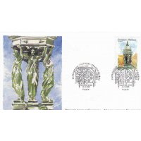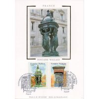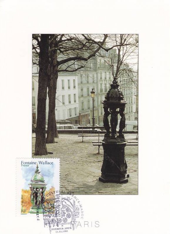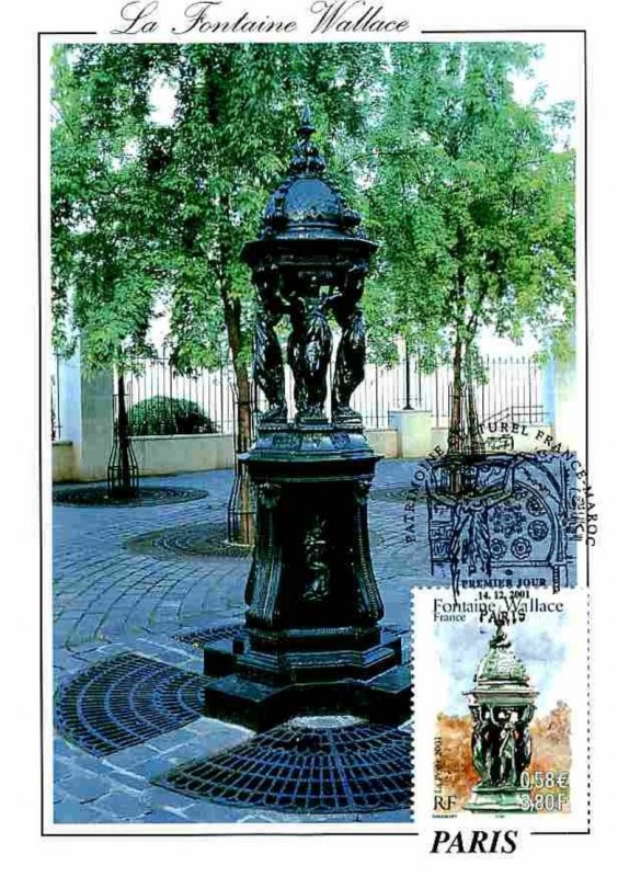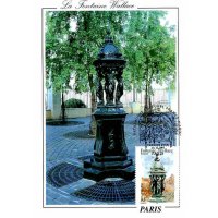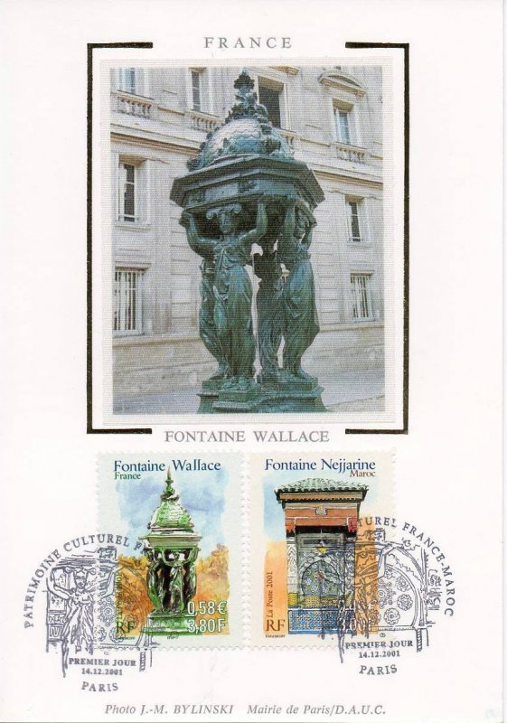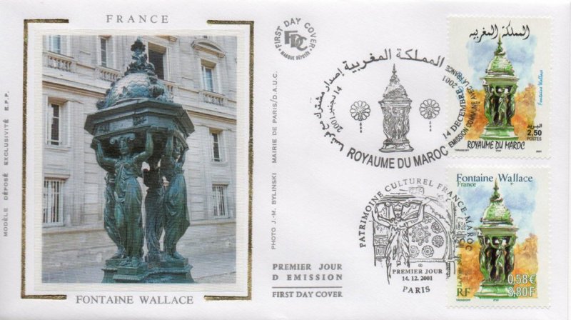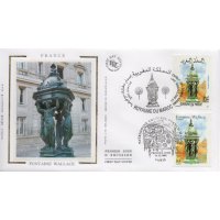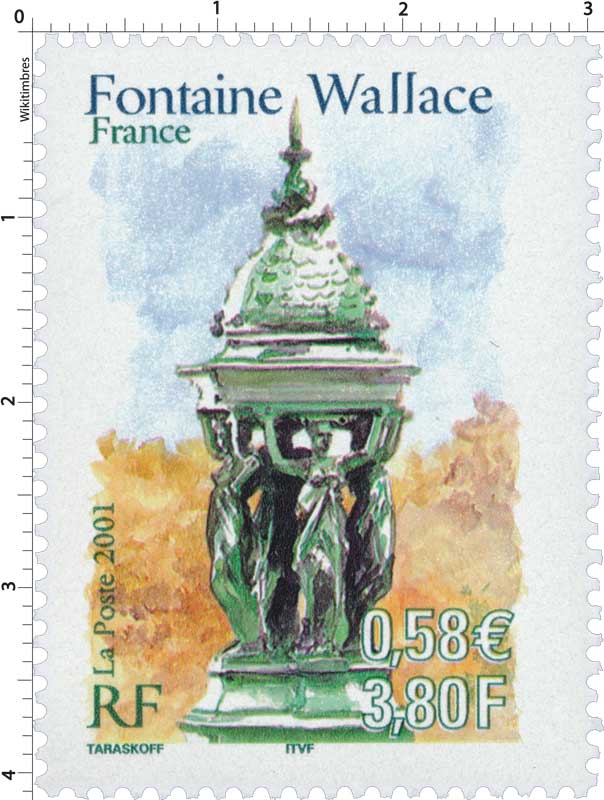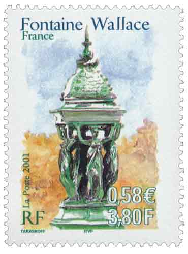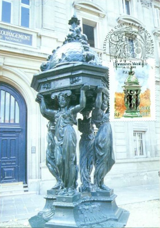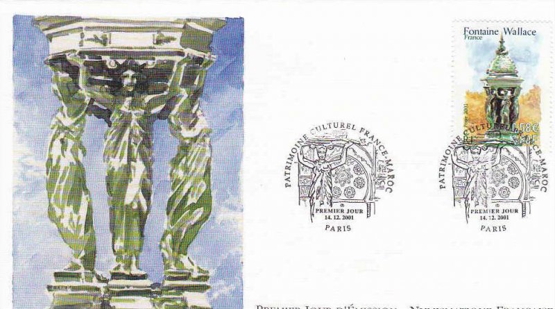 | Commentaire | Description synthétique du visuel du timbre : En accord avec le Maroc, le thème des fontaines a été retenu pour illustrer les 2 timbres de l’émission commune : la fontaine Nejjarine, situé à Fès et une fontaine Wallace, à Paris. Les fontaines Wallace furent conçues par Sir Richard Wallace sous plusieurs formes, alliant toute un usage utilitaire (fontaine à boire) et un souci d’esthétisme. Le « grand modèle » qui illustre le timbre est en fonte de fer peint en vert bouteille, teinte de l’ensemble du mobilier urbain de l’époque. La partie supérieure visible sur le timbre se compose de 4 caryatides se tournant le dos et soutenant un dôme décoré par des dauphins. La première fontaine de ce type fut inaugurée à Paris en août 1872Émission commune avec le Maroc. |