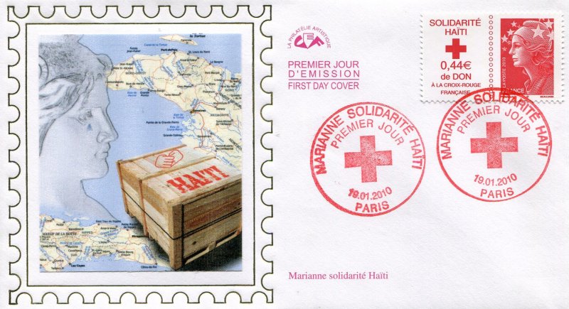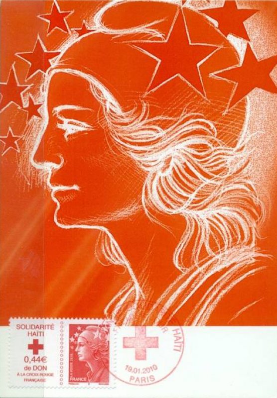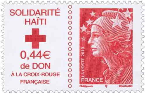 | Commentaire | Existe également en autoadhésif. La Poste émet un timbre « Solidarité Haïti ». Ce timbre exceptionnel d’une valeur de 1 € intégrant un don de 0,44 € au profit de la Croix-Rouge française représente la Marianne associée à un message de solidarité pour Haïti au profit de la Croix-Rouge fra |