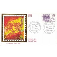 | Commentaire | Variété du point sur le I de française figurant sur le timbre de feuille de Jean-Paul Sartre. Le timbre issu du carnet est dentelé 15 x 15 demi |