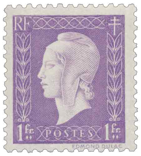 | Commentaire | Le timbre gommé « Marianne de Dulac » de 1 franc lilas, émis en France en 1945, s’inscrit dans la série d’usage courant mise en circulation à la Libération afin de rétablir une iconographie républicaine claire et consensuelle après la période de l’Occupation, en reprenant l’effigie de Marianne dessinée et gravée par Edmond Dulac, dont le modèle avait initialement été conçu pour les billets de banque français ; mis en vente le 17 mars 1945, ce timbre est spécifiquement destiné à l’affranchissement de la carte postale dite « de cinq mots », usage postal bien défini qui explique son tirage important et sa large diffusion, tandis que son impression en taille-douce à plat, réalisée à Londres par la maison Thomas De La Rue dans un contexte de capacités industrielles françaises encore limitées, constitue un élément philatélique notable de cette émission de transition. |