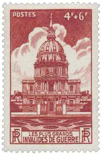 | Commentaire | Les plus grands Invalides de Guerre. Le timbre gommé de 1946 « Les plus grands invalides de guerre » s’inscrit dans les émissions de solidarité nationale de l’après-guerre, destinées à soutenir les anciens combattants gravement blessés. Mis en vente le 11 mars 1946, il répond à plusieurs usages postaux courants (lettre jusqu’à 50 g, imprimés ordinaires, valeurs déclarées), tout en comportant une surtaxe importante affectée à la Fédération nationale des plus grands invalides de guerre. Dessiné et gravé par Gabriel-Antoine Barlangue, le visuel met en avant la Hôtel des Invalides, lieu emblématique de l’accueil des soldats blessés depuis le règne de Louis XIV et haut lieu de la mémoire militaire française. L’impression en taille-douce rotative, le grand format vertical et la palette rouge-brun confèrent à l’ensemble une solennité adaptée à l’hommage rendu. Par sa durée de diffusion volontairement limitée, cette émission illustre l’usage du timbre comme instrument de mémoire, de reconnaissance nationale et de financement solidaire dans la France de la reconstruction. |