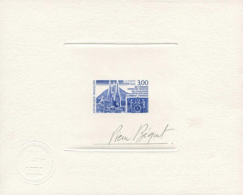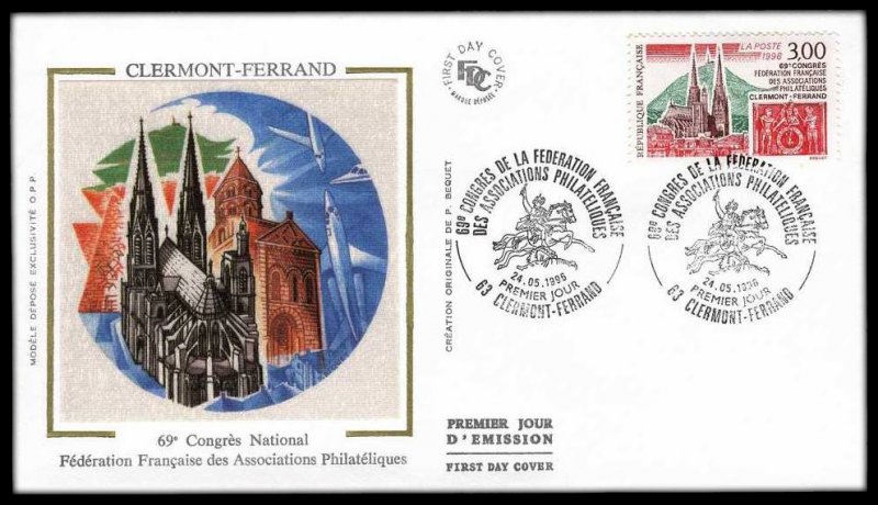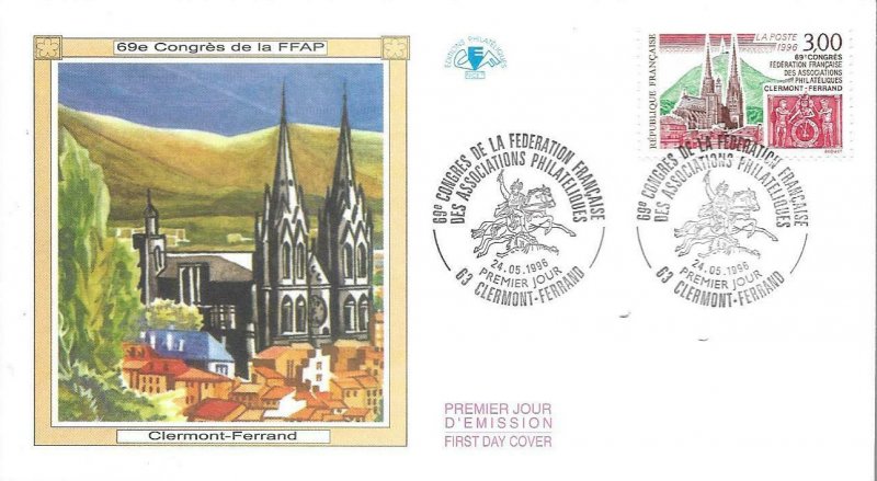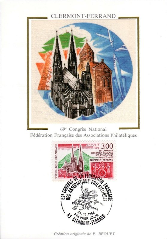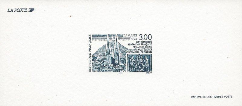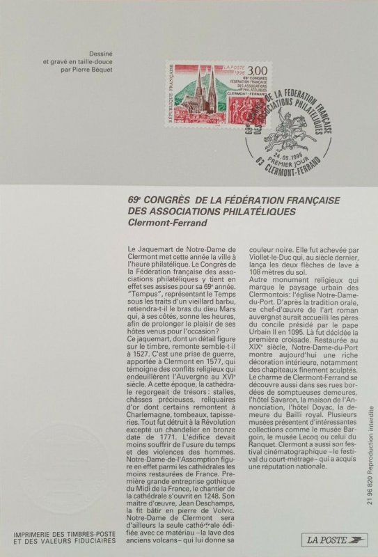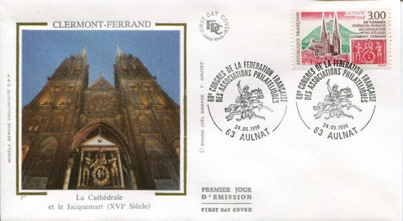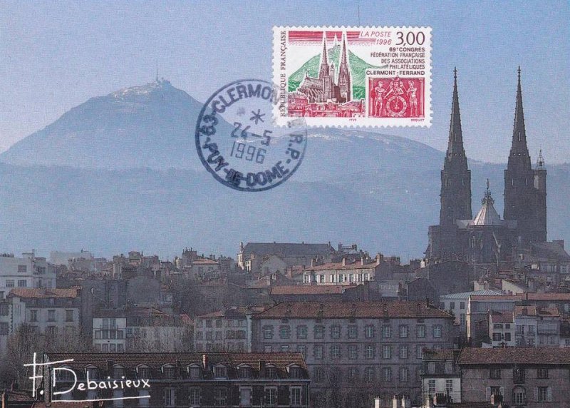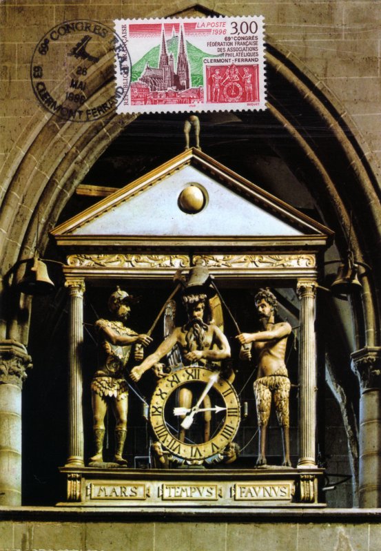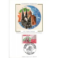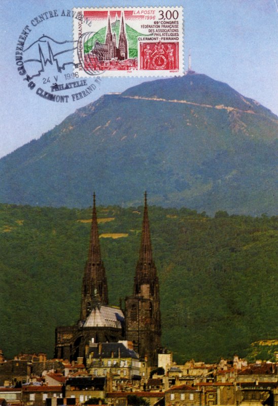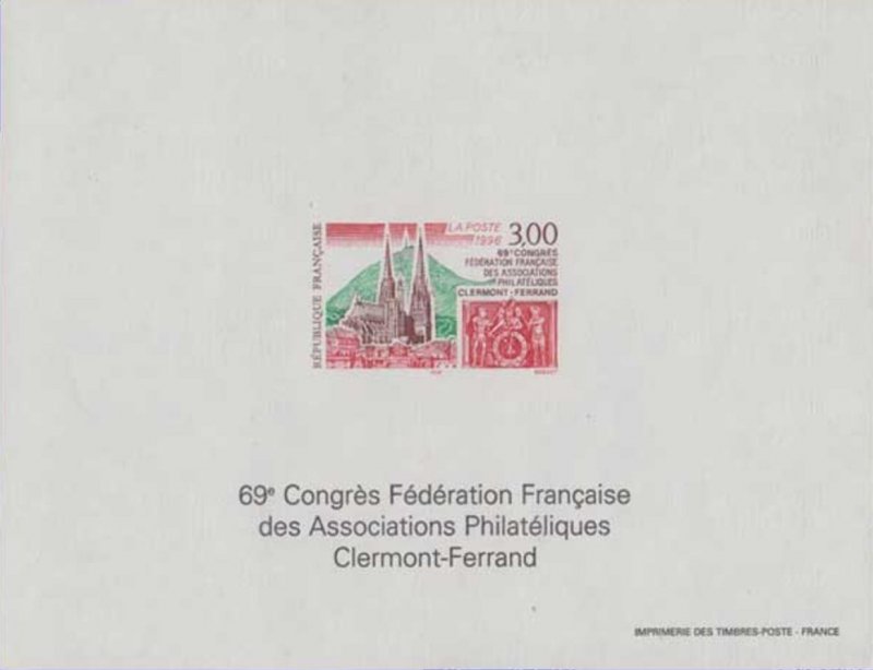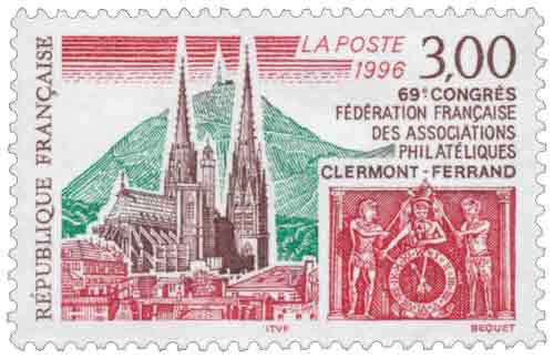 | Description | 69e Congrès de la Fédération Française des Associations Philatéliques, à Clermont-Ferrand, représentation de la cathédrale, du Puy de Dôme et horloge à automates du XVIe siècle |