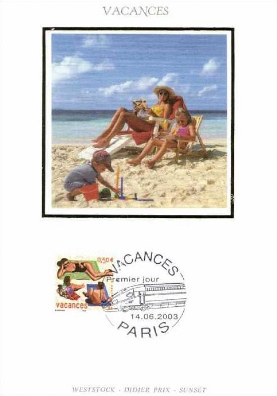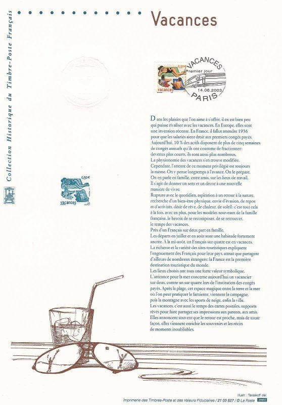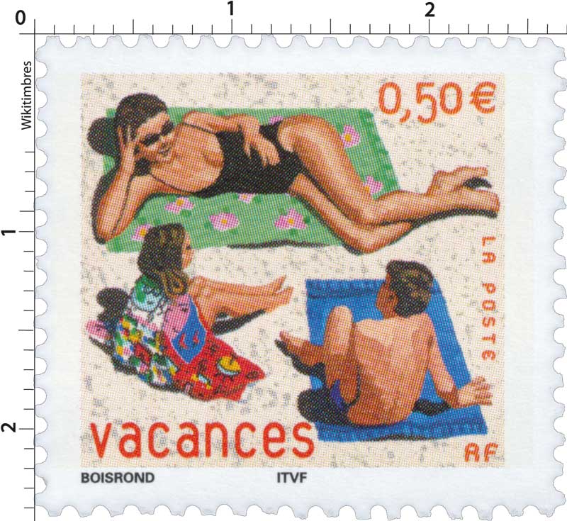 | Commentaire | Existe également en autoadhésif. Description synthétique du visuel du timbre : Les semi-permanents vacances constituent un timbre à succès faisant l’objet d’une nouvelle émission tous les ans. Une scène de vacances réalisée par François Boisrond et un format de timbre original permettent |