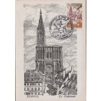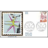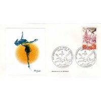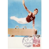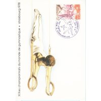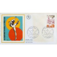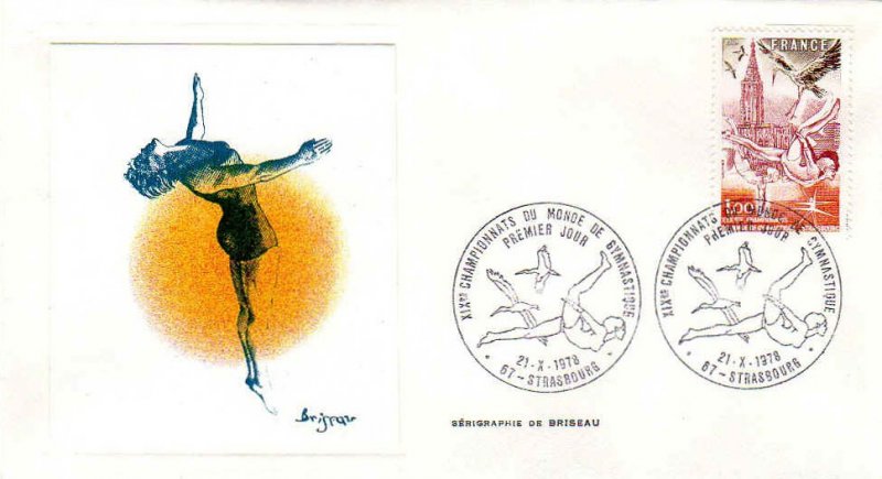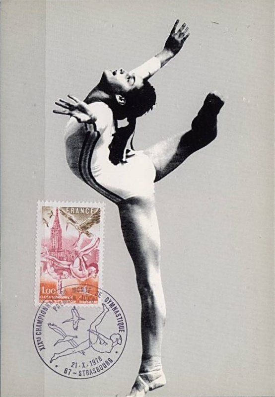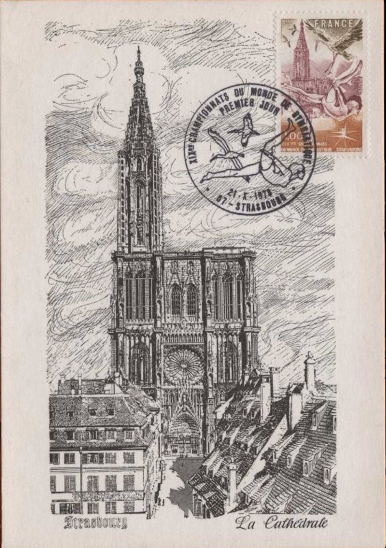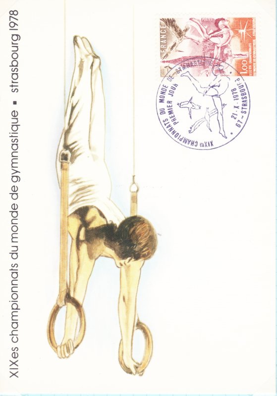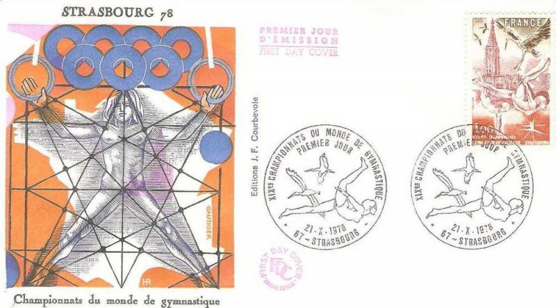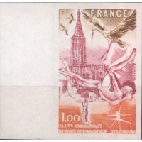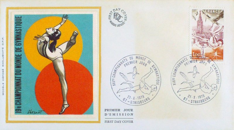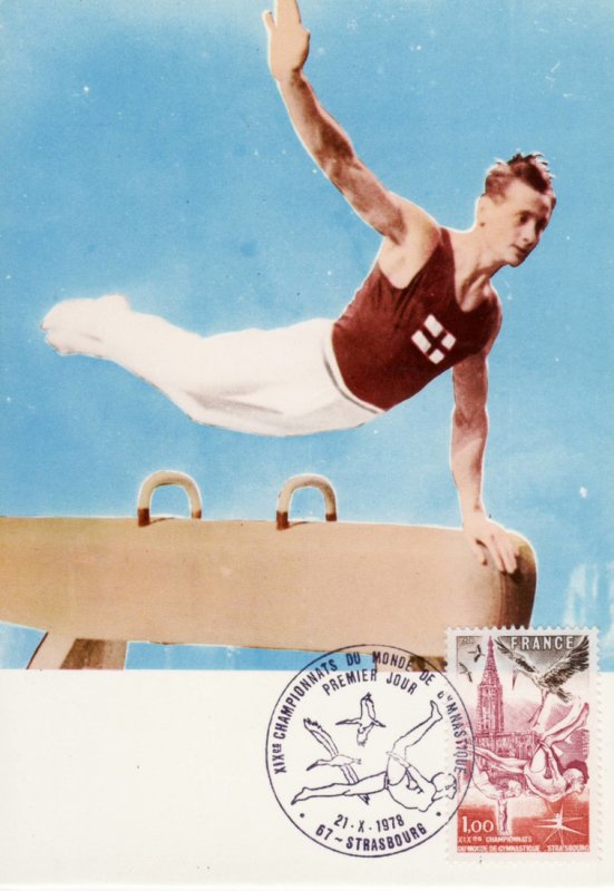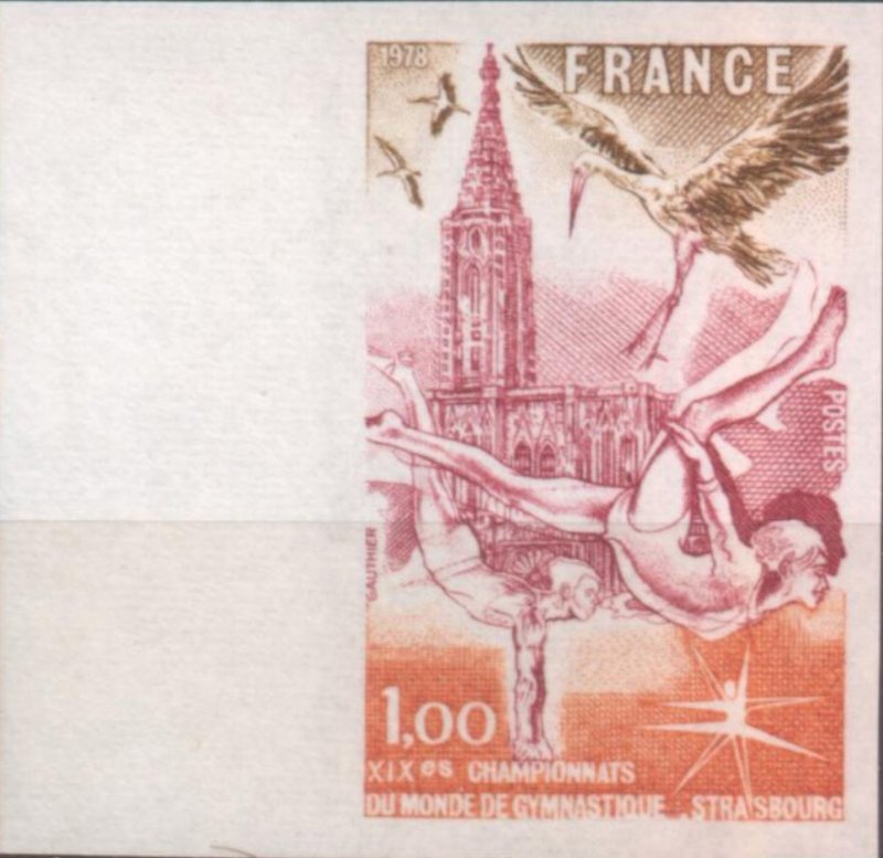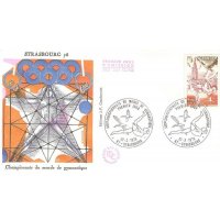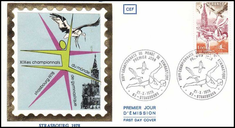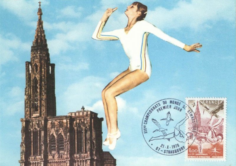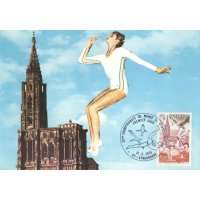 | Commentaire | Visuel : la remarquable cathédrale gothique Notre-Dame de Strasbourg (1176-1439), un vol typique de cigognes, une gymnase féminine et un gymnase masculin. Les Championnats du Monde de gymnastique masculine et féminine sont disputés tous les quatre ans, deux après, et deux avant les J.O. Une quarantaine de pays ont participés. Il y avait quatre types d'agrès féminins : barres asymétriques, poutre, saut de cheval et exercices au sol, avec accompagnement au piano. + six types d'agrès masculins : au sol, cheval-arçons, anneaux, saut de cheval, barre fixe |