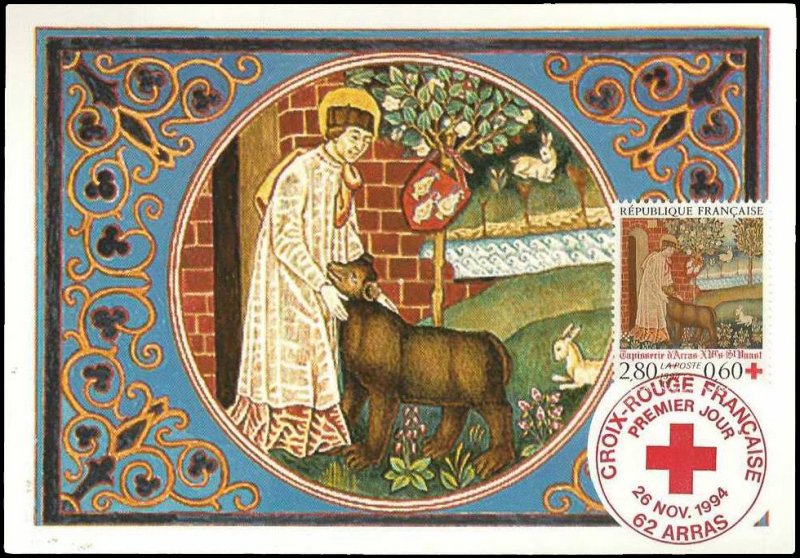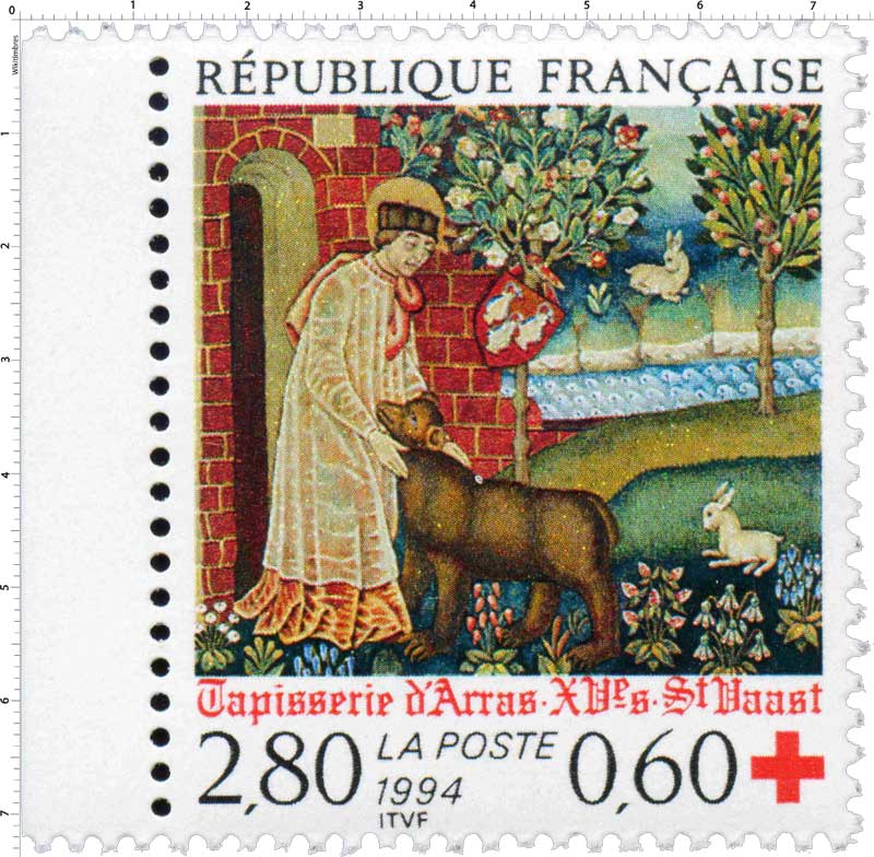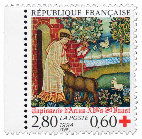 | Description | Au profit de la Croix-Rouge française. Tapisserie d'Arras du XVe siècle – Saint Vaast apprivoisant l'ours. Musée des Beaux Arts d`Arras |