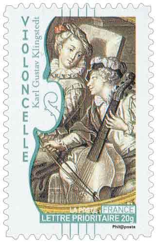 | Commentaire | Erreur dans le titre du timbre : il ne s'agit pas d'un violoncelle, mais d'une viole de gambe. |