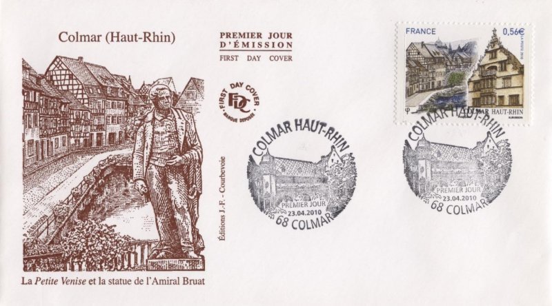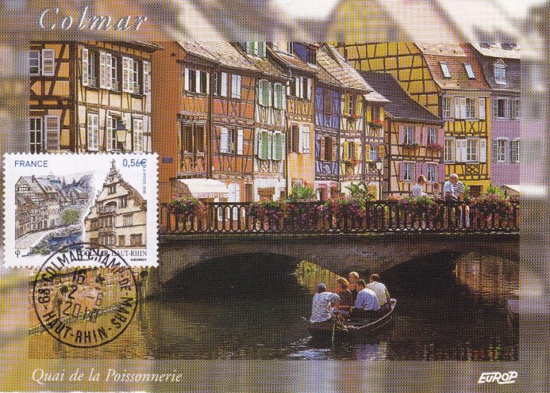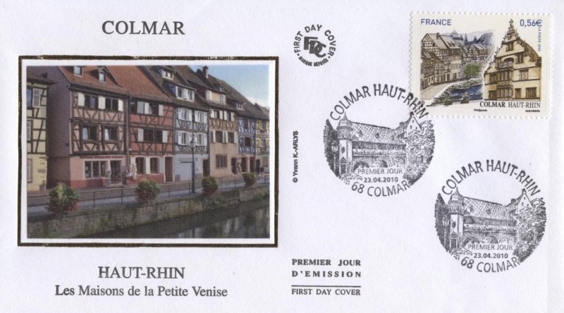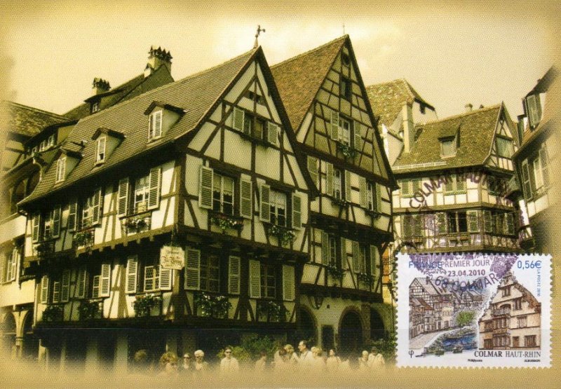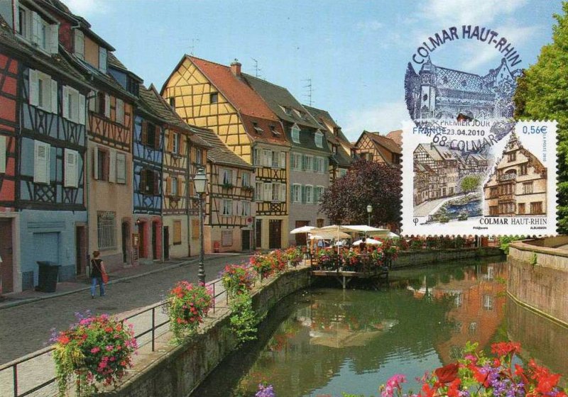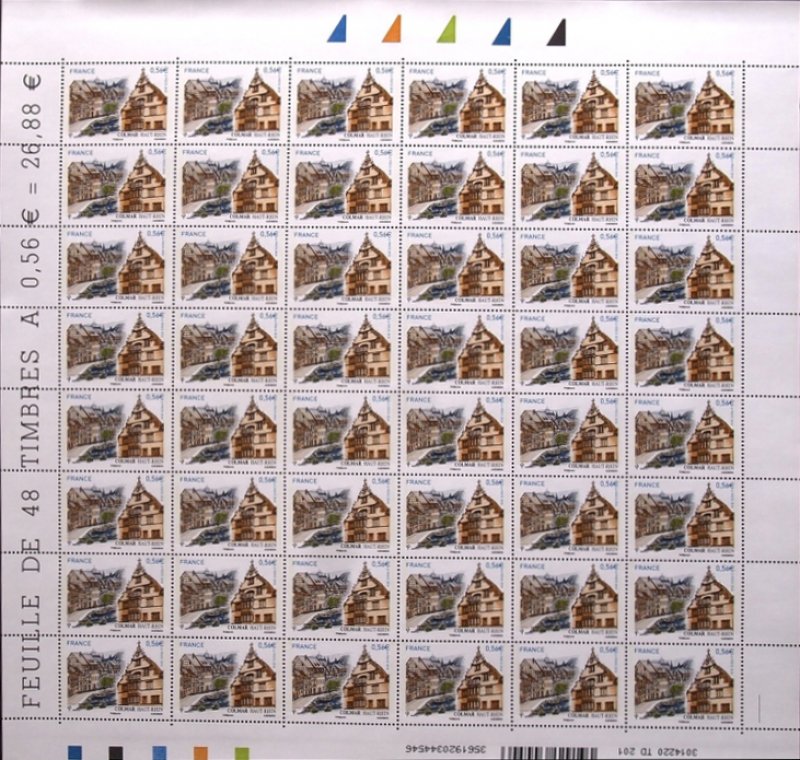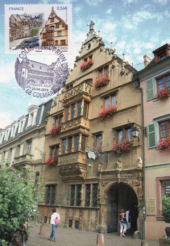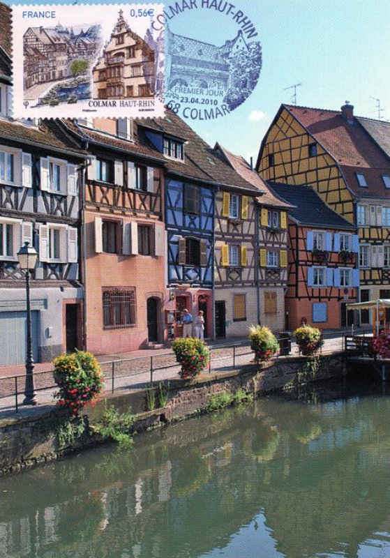 | Commentaire | Existe également en autoadhésif. Colmar, qu’on appelle aussi la « capitale des vins d’Alsace » est le chef-lieu du Haut-Rhin. La ville est située au pied du massif des Vosges, au coeur de l'Europe, à égale distance des centres prestigieux de Strasbourg et de Bâle et à 20 km seulement de la frontière allemande. Ville d'art et d'histoire, elle attire plus de trois millions de visiteurs chaque année. On dit d’elle que c'est un condensé de l'Alsace dans ce qu'elle a de plus caractéristique. Elle possède un grand nombre d'anciennes constructions typiques de l'architecture alsacienne (maisons à colombages) et de la Renaissance allemande ainsi que plusieurs églises de style gothique. En 2010, Colmar accueille le salon philatélique de Printemps. La Maison des têtes et une vue de La Petite Venise qui sont deux éléments emblématiques de la ville, illustrent le timbre émis à cette occasion. |