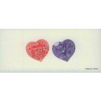 Timbres de caractère pour un message d’amour ; l’un est rouge lipstick, l’autre violet, entre les deux, le coeur balance selon le poids de la missive.