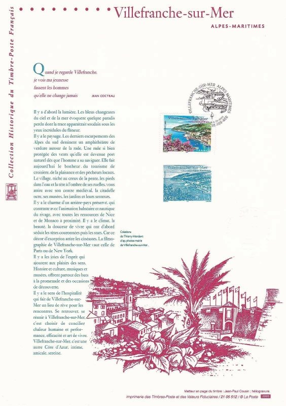 | Commentaire | Villefranche-sur-Mer est située au fond d’une très belle rade, entre Nice et Monte-Carlo. De nombreux artistes y ont séjourné, dont Jean Cocteau. La ville aux façades colorées a su conservé un certain cachet historique. La chapelle Saint-Pierre, l’Église Saint-Michel, la « rue obscure », le port et la citadelle en constituent les éléments emblématiques. |
