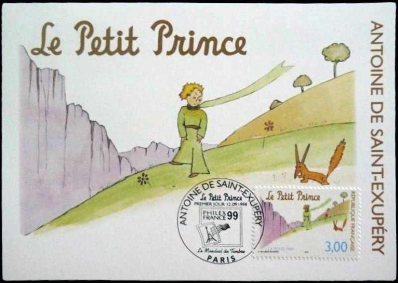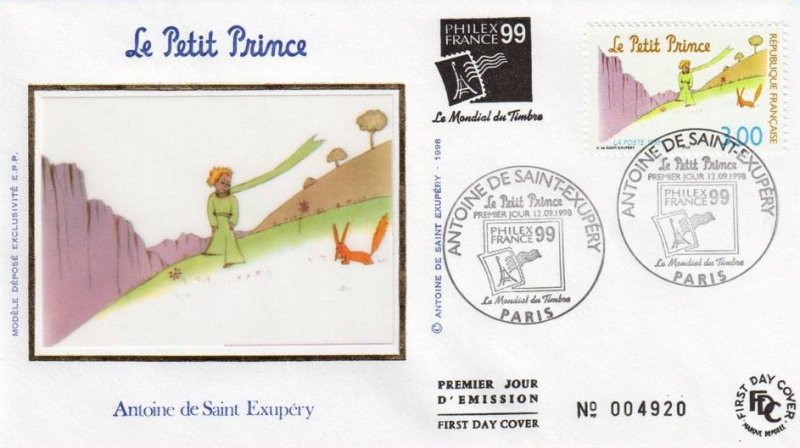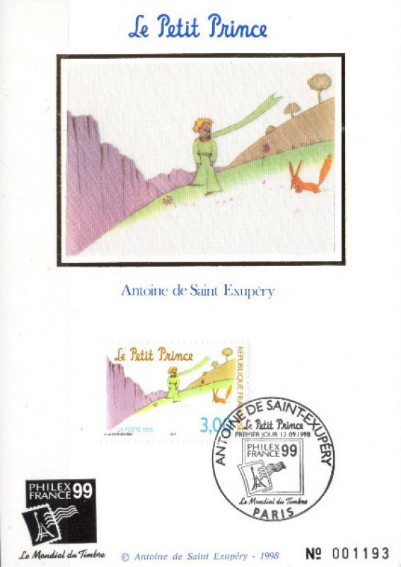 | Description | PhilexFrance 99. Exposition philatélique internationale. Le Petit Prince d'Antoine de Saint-Exupéry (1900-1944), écrivain, poète et aviateur français, né à Lyon |