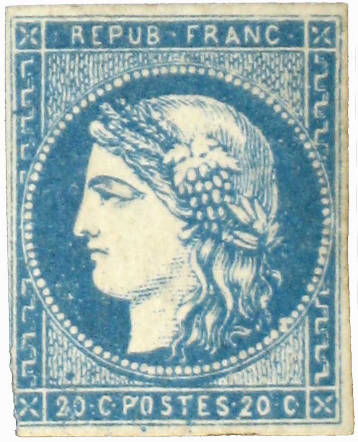 | Commentaire | Cérès - Émission de Bordeaux. Type I - Report 2. Le 20 centimes bleu, n°44B, appartient à l’Émission de Bordeaux, période où la Poste française doit improviser une production de timbres en raison du siège de Paris et de la désorganisation complète des ateliers officiels. Mis en vente autour du 18 novembre 1870, il relève du type I, réalisé d’après le dessin original de Charles Dambourgez, lithographe chargé d’élaborer le premier modèle du 20c. Ce dessin, d’une finesse remarquable, constitue le point de départ de la série, mais se révèle difficile à reproduire durablement en lithographie. L’usure rapide des pierres impose de créer plusieurs matrices successives, chacune présentant des différences légères. Le n°44B correspond au report 2, deuxième transfert du motif sur pierre, identifiable par un aspect général légèrement modifié par rapport au report 1. La distinction entre les reports reste délicate, les variations tenant davantage aux conditions d’impression qu’à des différences volontaires de gravure. Face aux limites techniques du modèle initial, les tirages suivants du 20c sont confiés à Léopold Yon, dont la version simplifiée donnera naissance au type II. Le 20c type I, en particulier dans ses différents reports, demeure l’une des valeurs les plus recherchées de l’Émission de Bordeaux en raison de la finesse du dessin de Dambourgez et du contexte exceptionnel de sa réalisation. |