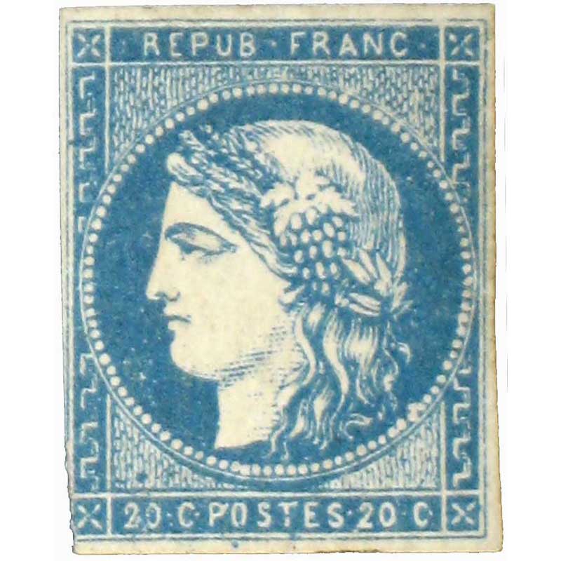 | Commentaire | Cérès - Émission de Bordeaux. Type I - Report 2. Le 20 centimes bleu, n°44B, appartient à l’Émission de Bordeaux, période où la Poste française doit improviser une production de timbres en raison du siège de Paris et de la désorganisation complète des ateliers officiels. Mis en vente autour du 18 novembre 1870, il relève du type I, réalisé d’après le dessin original de Charles Dambourgez, lithographe chargé d’élaborer le premier modèle du 20c. Ce dessin, d’une finesse remarquable, constitue le point de départ de la série, mais se révèle difficile à reproduire durablement en lithographie. L’usure rapide des pierres impose de créer plusieurs matrices successives, chacune présentant des différences légères. Le n°44B correspond au report 2, deuxième transfert du motif sur pierre, identifiable par un aspect général légèrement modifié par rapport au report 1. La distinction entre les reports reste délicate, les variations tenant davantage aux conditions d’impression qu’à des différences volontaires de gravure. Face aux limites techniques du modèle initial, les tirages suivants du 20c sont confiés à Léopold Yon, dont la version simplifiée donnera naissance au type II. Le 20c type I, en particulier dans ses différents reports, demeure l’une des valeurs les plus recherchées de l’Émission de Bordeaux en raison de la finesse du dessin de Dambourgez et du contexte exceptionnel de sa réalisation. |
