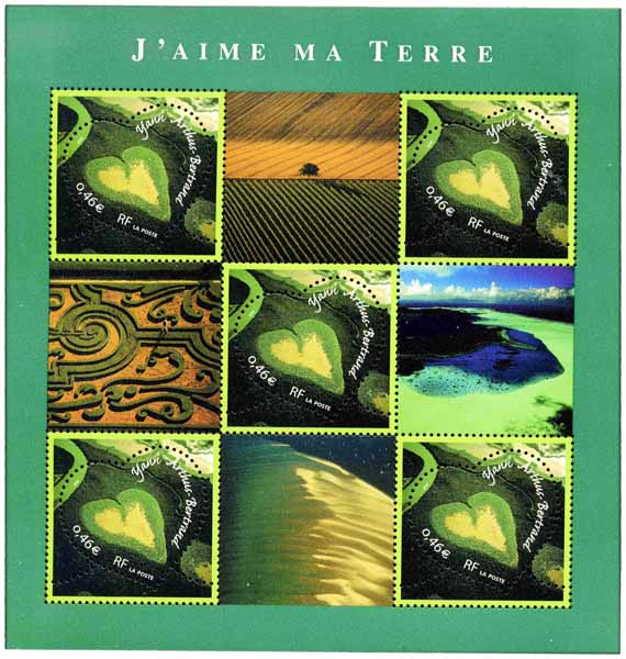 | Commentaire | Description synthétique du visuel du timbre : Yann Arthus-Bertrand a composé en images le portrait d’une « Terre belle et fragile ». Avec ce portrait il entend léguer aux générations futures un témoignage d’émerveillement et de vigilance : « Parce qu’on ne protège bien que ce que l’on connaît bien » déclare ce photographe humaniste. Le bloc se compose de 5 timbres illustrés par le cœur de Voh (Nouvelle-Calédonie) qu’agrémentent 4 autres vues du paysage français : les vignes à Cognac, les jardins de Vaux le Vicomte, Bora Bora et le banc d’Arguin à l’embouchure du bassin d’Arcachon. Timbre sans millésime |