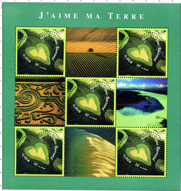 | Commentaire | Description synthétique du visuel du timbre : Yann Arthus-Bertrand a composé en images le portrait d’une « Terre belle et fragile ». Avec ce portrait il entend léguer aux générations futures un témoignage d’émerveillement et de vigilance : « Parce qu’on ne protège bien que ce que l’on connaît bien » déclare ce photographe humaniste. Le bloc se compose de 5 timbres illustrés par le cœur de Voh (Nouvelle-Calédonie) qu’agrémentent 4 autres vues du paysage français : les vignes à Cognac, les jardins de Vaux le Vicomte, Bora Bora et le banc d’Arguin à l’embouchure du bassin d’Arcachon. Timbre sans millésime |